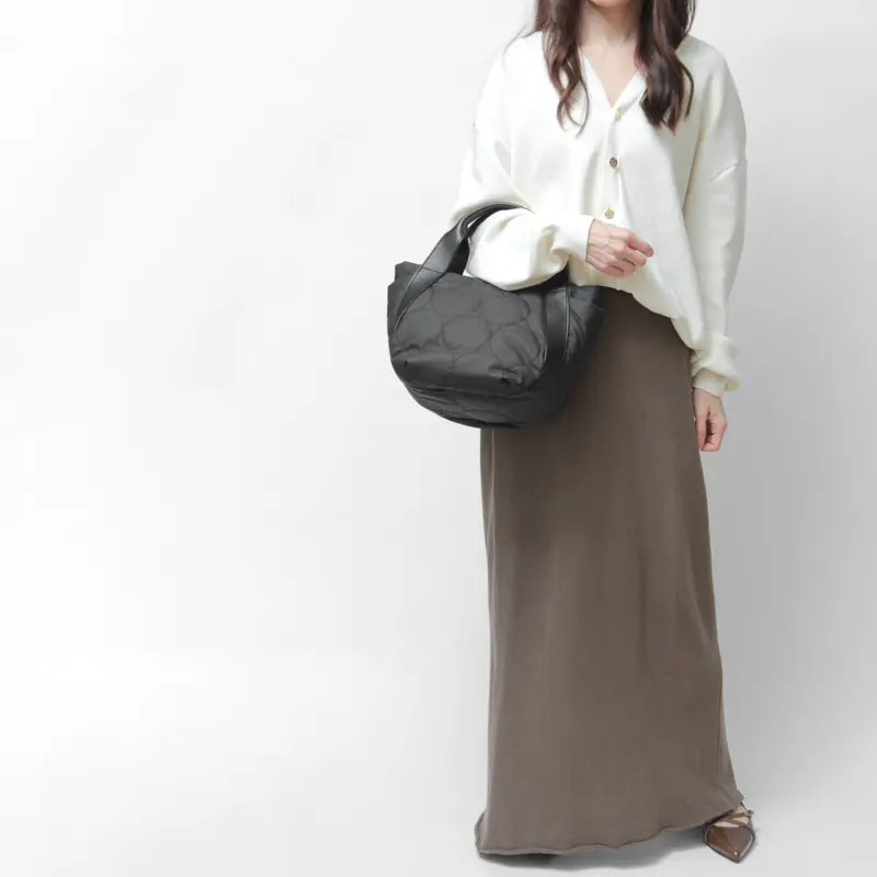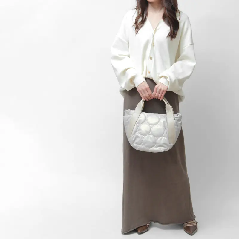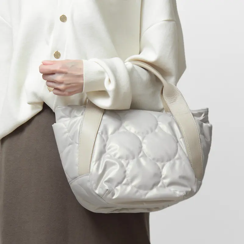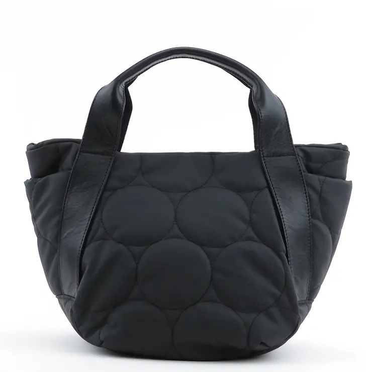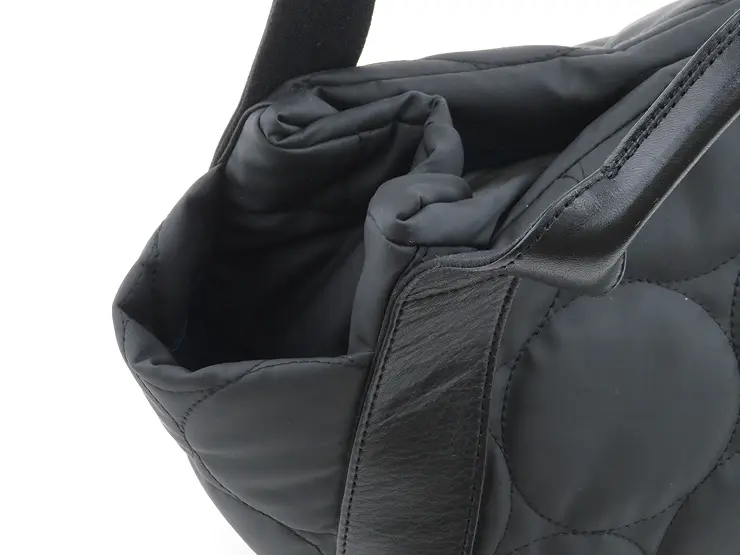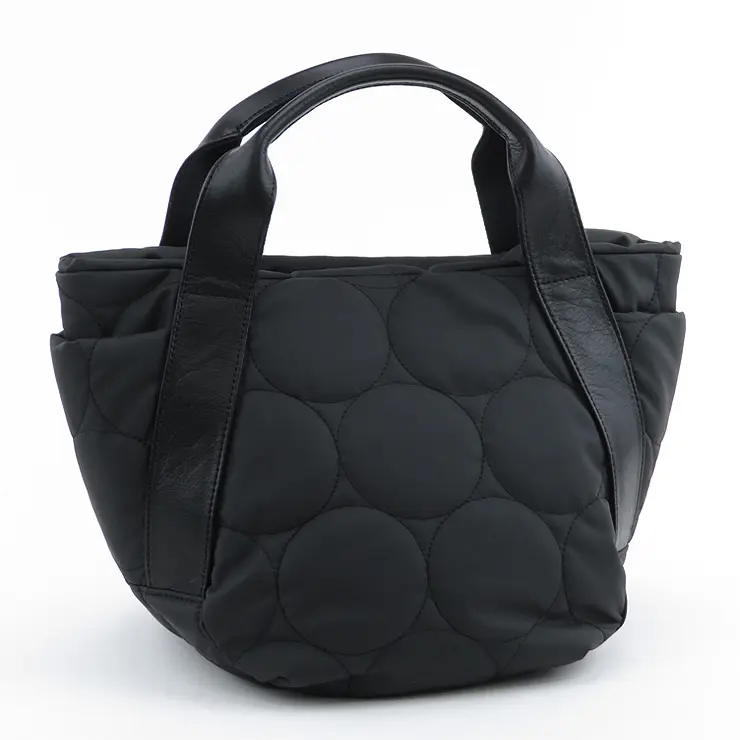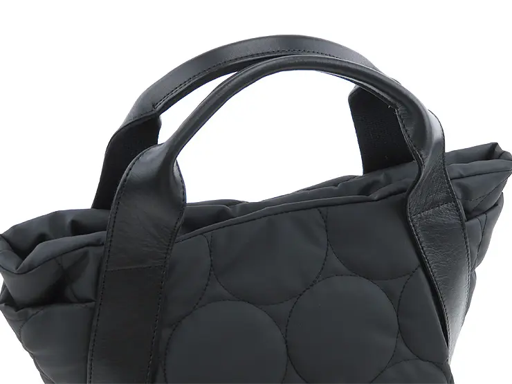 ふっくらと軽やかなドットキルティングトート。カジュアルな撥水ナイロン素材を落ち着いた質感で仕上げ、本革ハンドルが上品に引き締めます。 きれいめにもカジュアルにも決まり、大人のきれいめカジュアルスタイルに洗練された抜け感をプラス。大きすぎず、毎日のお出かけにちょうどいいサイズで、軽量だから通勤や旅行にも最適です。