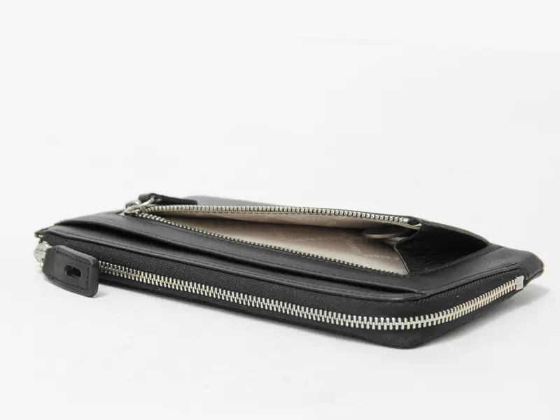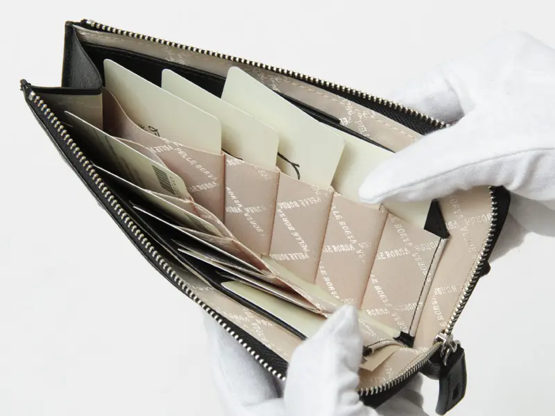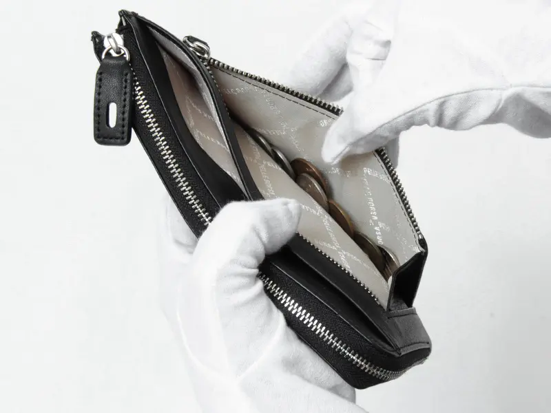 L字ファスナーを開くだけで中身が見渡せるストレスフリーなつくり。財布を“縦方向のまま”扱えるため、カード・お札・小銭までの一連の動作が自然につながり、支払いがとてもスムーズです。向きを変えたり持ち替えたりする手間がなく、落ち着いた所作でスマートにお会計が完了します。