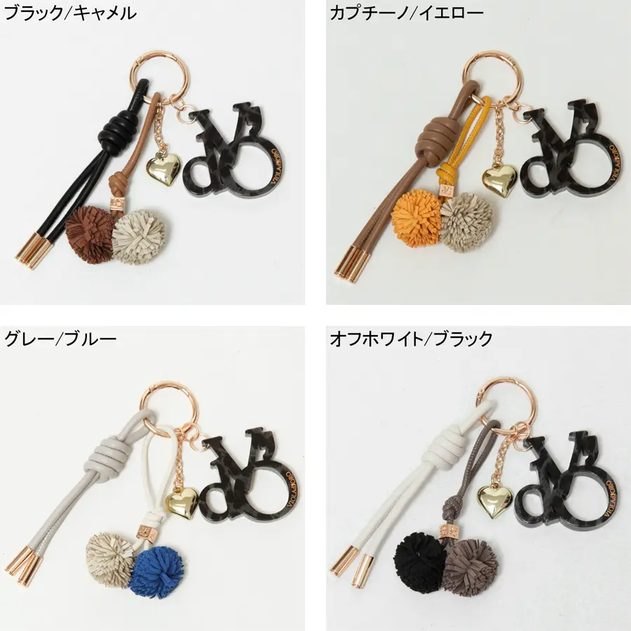 4種類のパーツがセットになったバッグチャーム。レザーコード、ハートチャーム、オリジナルロゴ、スエードのポンポンパーツが揃い、軽量で程よいサイズ感なので、バッグに付けても邪魔にならず、さりげないアクセントとして楽しめます。