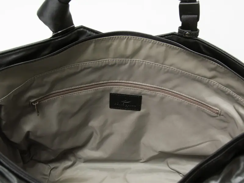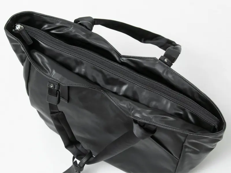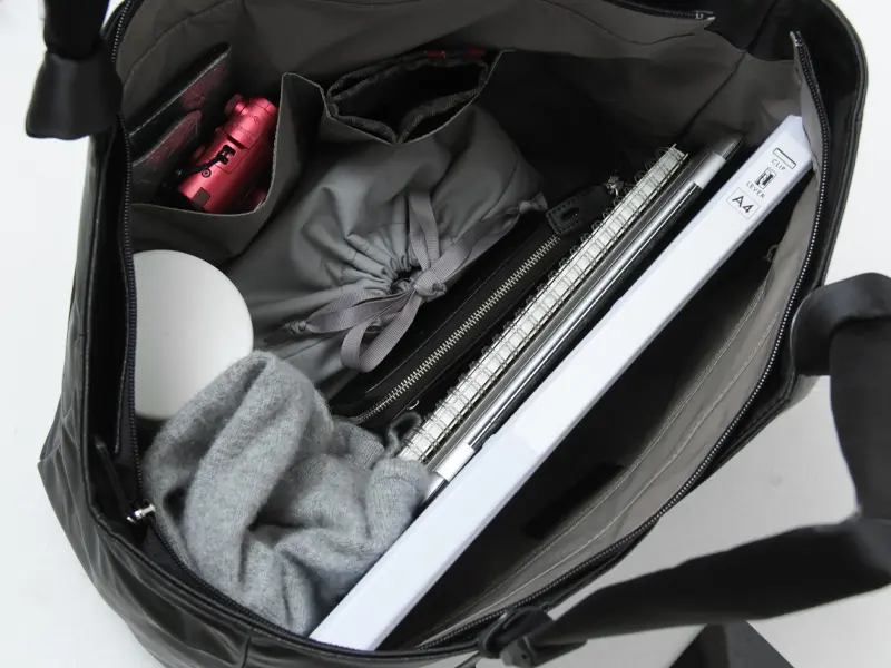 開閉は安心のファスナー式。A4ファイルやタンブラー、上着まで+αでしっかり入るゆとりのあるサイズ感です。