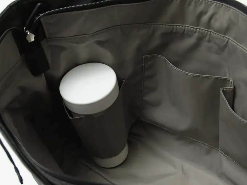 広めのマチでお弁当箱など幅のある荷物も収納しやすく、タンブラーやペットボトルをすっきり収めるボトルフォルダーも備えています。