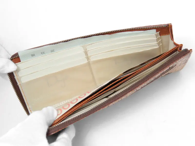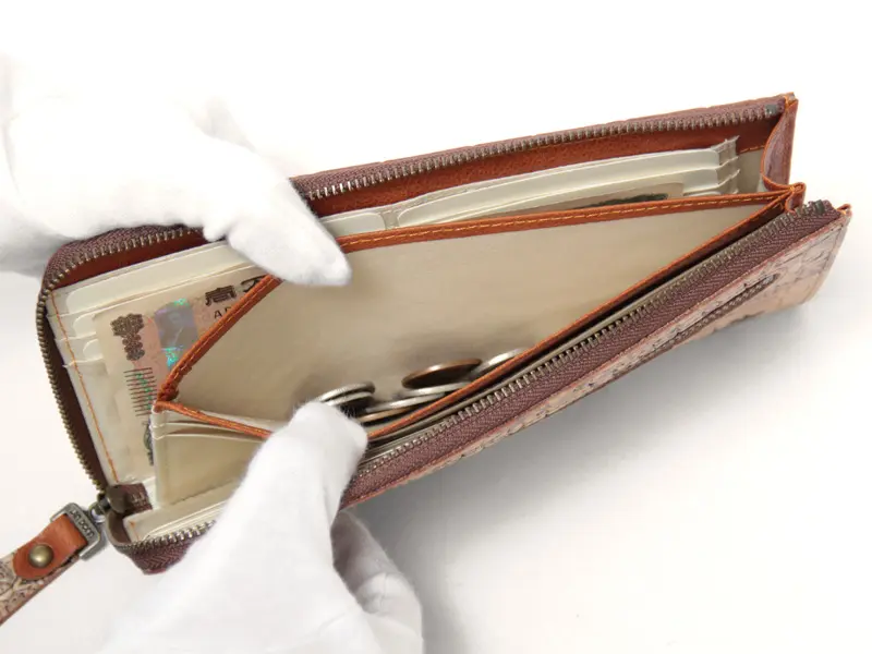 L字ファスナー財布は、開けるとお金やカードなど中身が一目で確認できるのが魅力。どこに何があるかすぐに分かるので、お会計もスムーズです。カードは全部で20ヶ所あり、20枚以上まとめて収納できます。オープンポケットも付いているので、免許証や保険証、領収書などもすっきり整理できます。