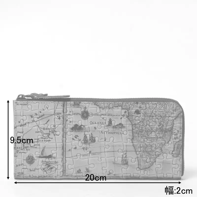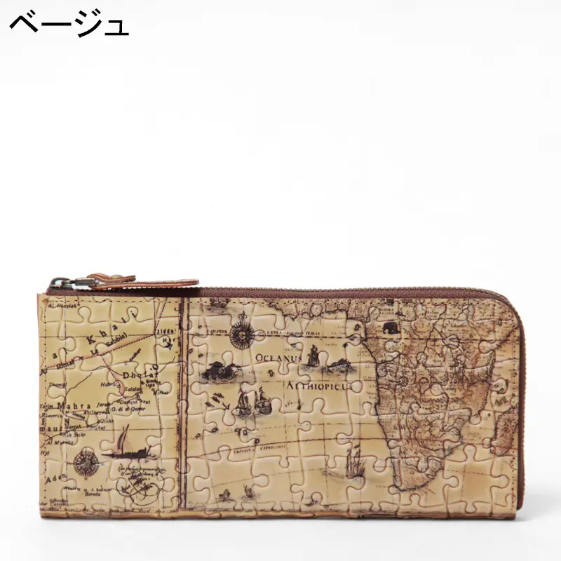 レトロ調の世界地図プリントにパズル型の型押しを施したお財布シリーズです。アンティーク風の仕上がりで、ひとつひとつ柄が異なるため、世界にひとつだけの特別なお財布としてお使いいただけます。付属の革には日本製ヌメ革を使用しており、使い込むほどに味わい深い経年変化を楽しめます。