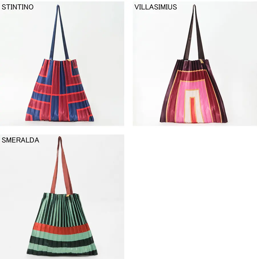 イタリアならではの色彩感覚と遊び心が息づくトートバッグ。プリーツが生み出す陰影と、鮮やかなプリント柄が重なり合うことで、光の当たり方や動きによって表情が変わります。しなやかなサテン生地は軽く、持った瞬間に感じる柔らかさと高級感が魅力。デイリーコーデに個性を添えるだけでなく、旅行やお出かけにも気軽に取り入れられる華やかさが魅力の一品です。