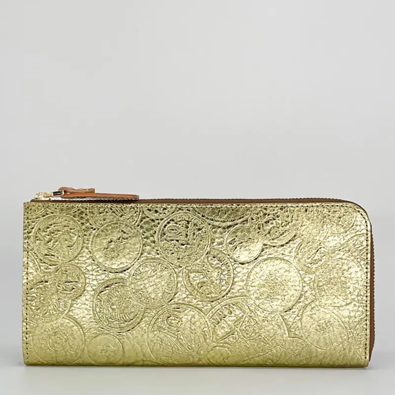 遊び心と上品さを兼ね備えたVIA DOAN(ヴィア ドアン)の“COIN コイン”シリーズ。欧州のコインを型押しした牛革に、ブランド別注のゴールドとシルバー箔を施した、華やかで個性的なデザインです。アンティーク調の風合いで、一つとして同じ表情のない“唯一無二”のL字ファスナー長財布。収納力は十分ながらも、スリムで持ちやすい薄型デザイン。毎日のスタイルにそっと華やぎを添える、日本製のロングウォレットです。