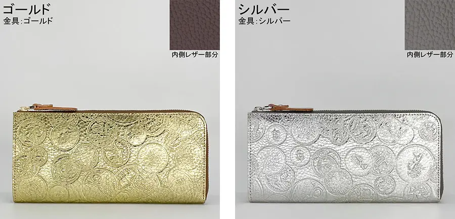 イタリアンレザーにレトロ感のある欧州のコインを型押しし、VIA DOAN別注のゴールドとシルバーの箔加工を施したお財布シリーズ。アンティーク調の風合いで、一つとして同じ柄がないため、唯一無二の表情を楽しめます。