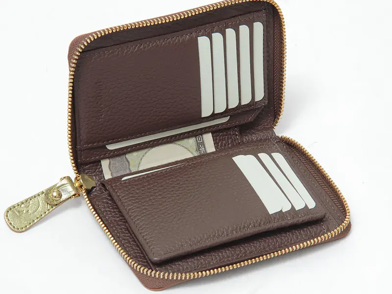 ファスナーを開けると180度まで大きく開き、中身がひと目で確認でき、出し入れもスムーズ。カードポケットは9ヶ所あり、それぞれの背面にもフリーポケットを備えています。