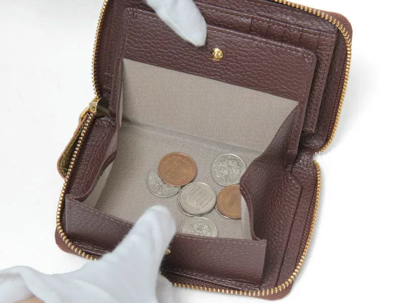 右側のカードポケットの下にはスナップボタン付きの小銭入れを配置。ボックス型で大きく開くため、小銭が取り出しやすく、お会計もスムーズです。