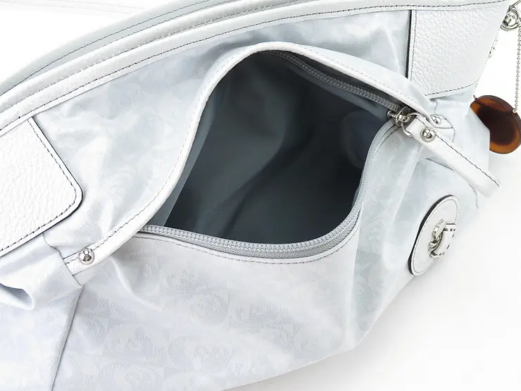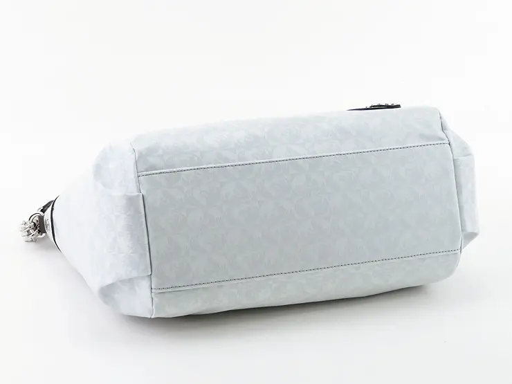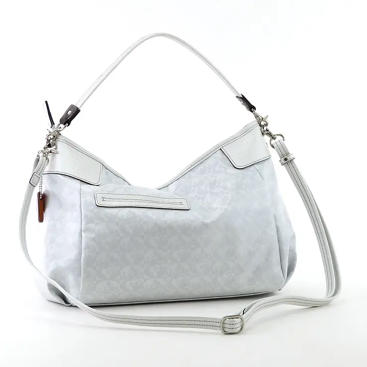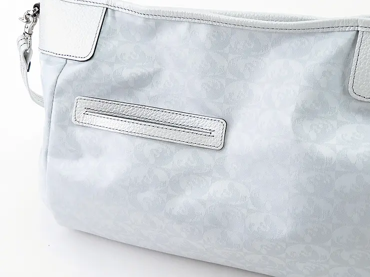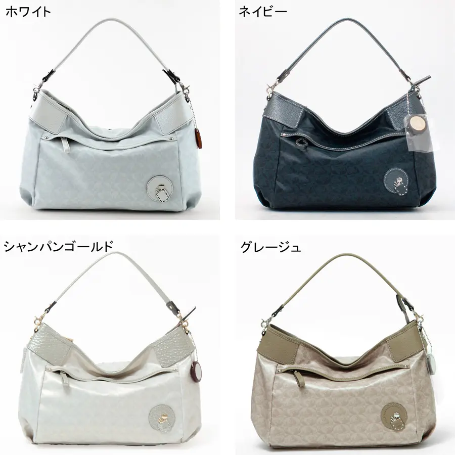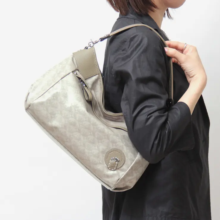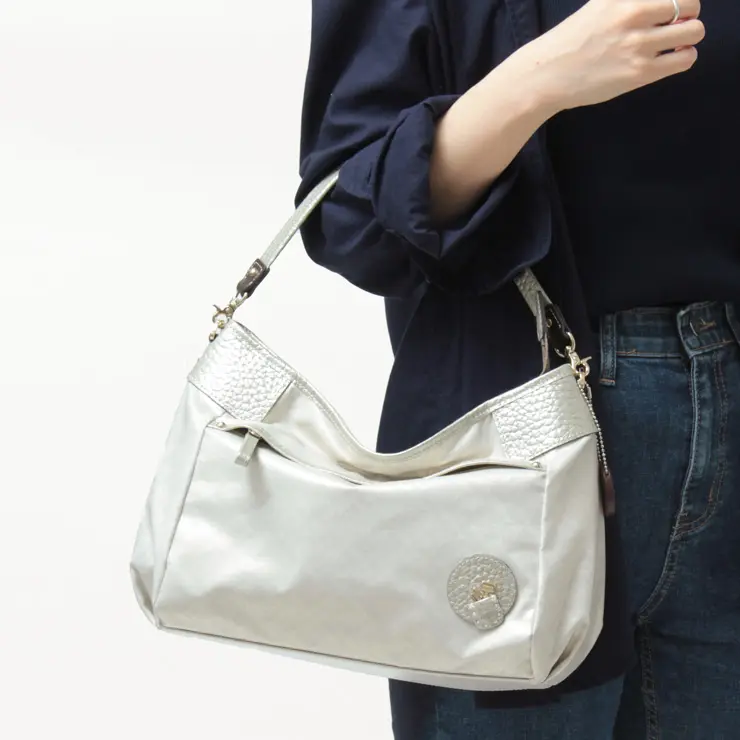 ハンドルやショルダーストラップなどのレザー部分にはパール加工を施した牛革を使用し、ほのかな光沢感がエレガントな雰囲気を演出します。