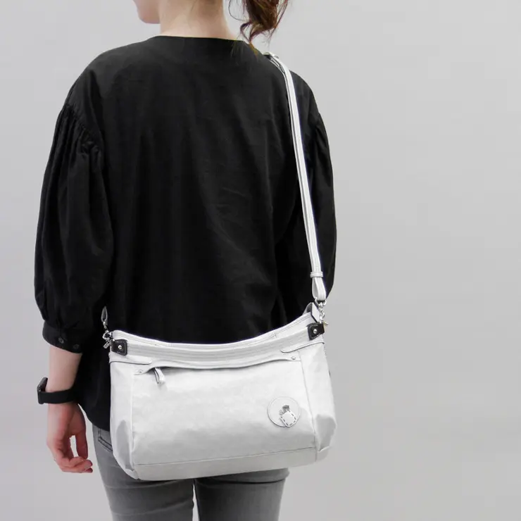 ショルダーストラップは長さ調節が可能で、肩がけや斜めがけでお持ちいただけます。ハンドルもストラップも取り外しできるので、付け替えたり、両方付けたままでもご使用いただけます。品良くワンハンドルで、アクティブに斜め掛けで、幅広いシーンやスタイルに対応します。
