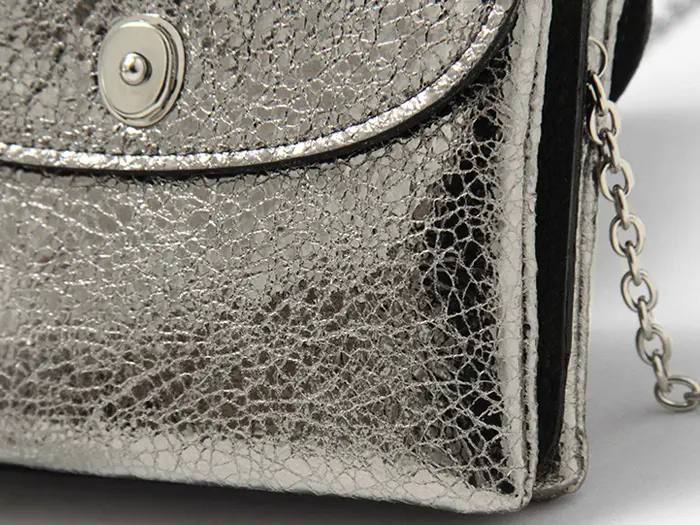 シルバーは柔らかな山羊革に、特殊な加工でひび割れ(クラック)模様を施しました。光を反射するメタリックな輝きと、モードなヴィンテージ感が融合した個性的な表情が魅力です。内装にはきめ細やかな豚革を採用。通気性が良く、さらりとした手触りでお財布の中身を優しく守ります。