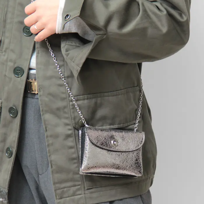 ミリタリーのポーチをモチーフにした"POMTATA ポンタタ"のお財布ポシェット。L字ファスナーのミニ財布にシルバーチェーンをドッキングさせた、ポケット感覚で必需品を持ち歩くのにとても便利なアイテム。アクティブなお出かけや旅行先など、貴重品を肌身離さず持てるポーチウォレットです。