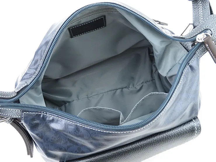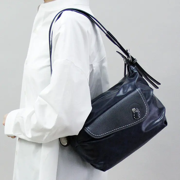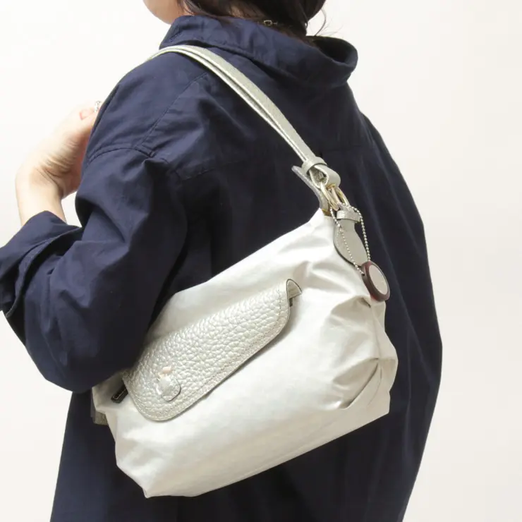 ハンドルやショルダーストラップなどのレザー部分にはパール加工を施した牛革を使用し、ほのかな光沢感がエレガントな雰囲気を演出します。