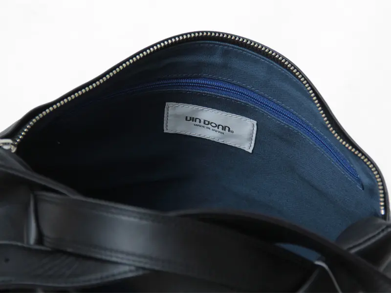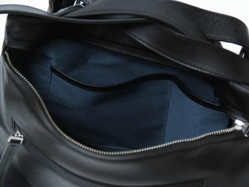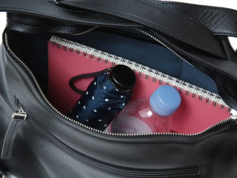開閉はファスナー仕様で、背面側に配置されています。B5サイズの冊子やノートなどが横向きで収まり、500mlのペットボトルや折り畳み傘も収納可能です。内側にはファスナーポケットやオープンポケットがあり、小物の整理もスムーズに行えます。バッグの内装にはコットン生地を採用し、自然な温かみと使いやすさをプラスしました。