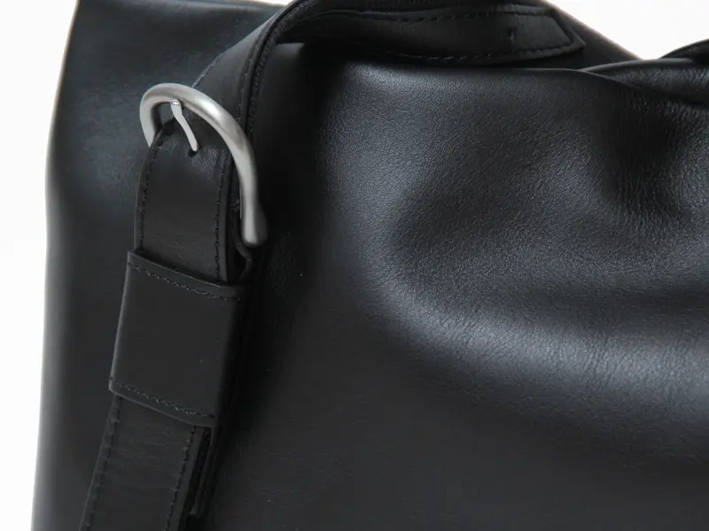 レザーのショルダーベルトは長さ調節可能。最大約100cmまで伸ばすことができます。裏側も綿素材で、肩にかかるストレスを抑えた快適な掛け心地です。