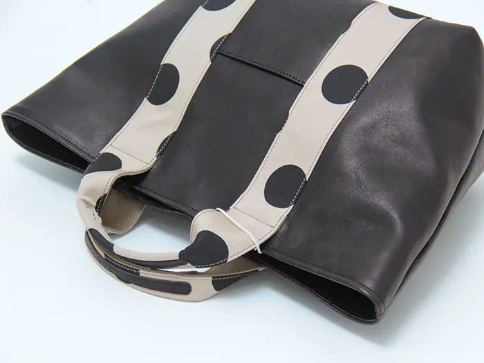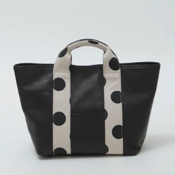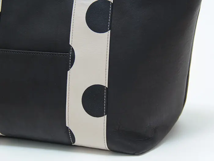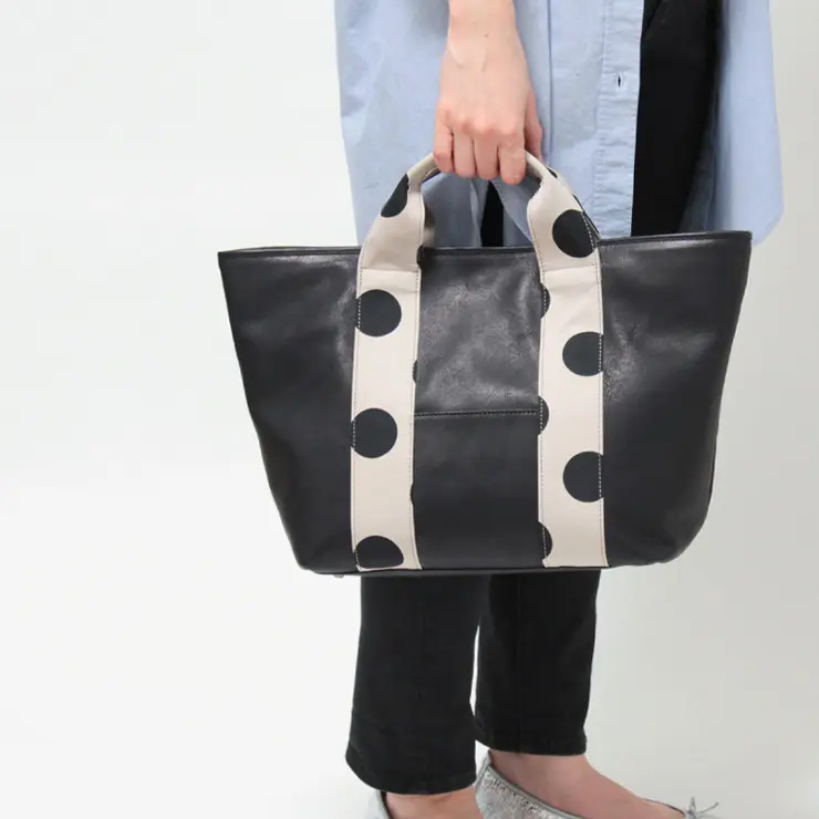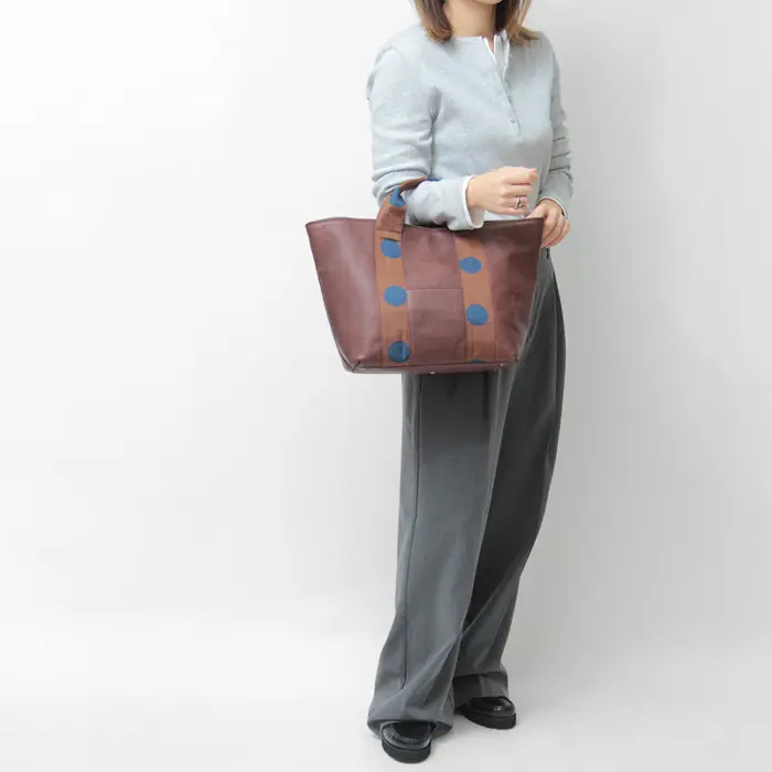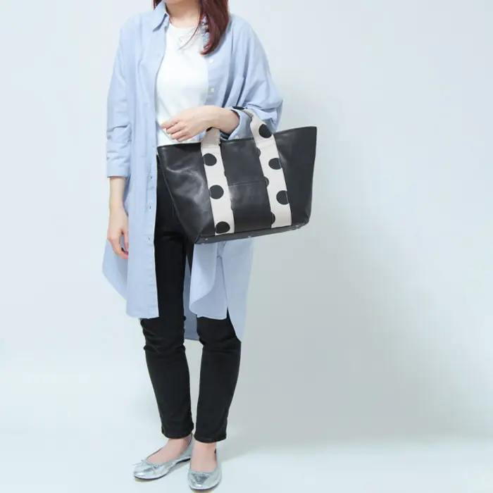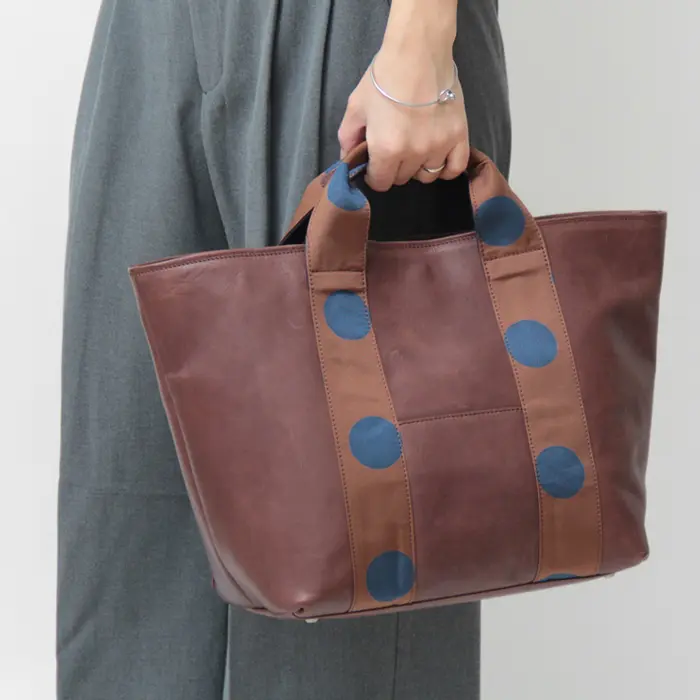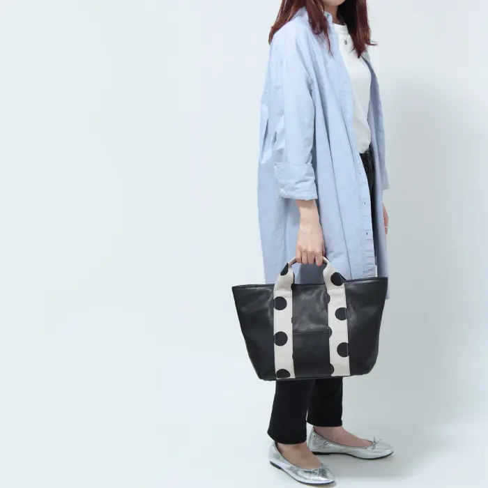 革本来の風合いを楽しむ素上げレザーに、大胆なドット柄テープをあしらった「レッセフェール」の"スフェール"シリーズ。オールレザーながら軽量なトートバッグは、A4ファイルやお弁当も入るサイズ感。大胆なドット柄のデザインは、コーディネートのアクセントになり、ぐっと印象的に格上げしてくれます。