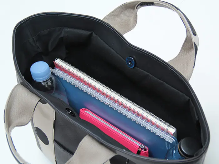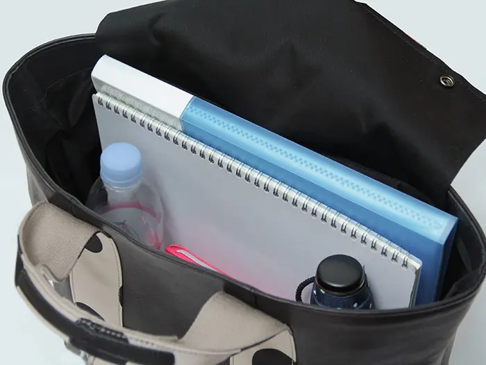 開閉は、片手でスマートに操作できるワンタッチのマグネット仕様。 メインルームは、B5サイズのノートや500mlのペットボトルが無理なく収まる、使い勝手の良いサイズです。 広めのマチにより、お弁当箱など幅のある荷物も安定して収納できます。