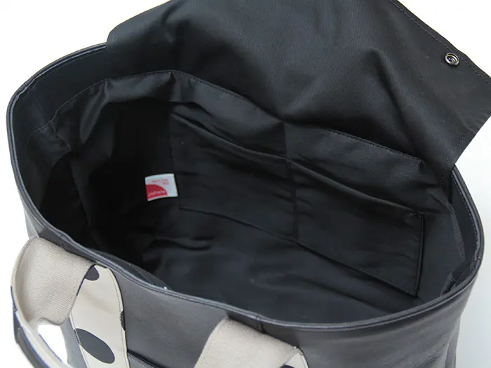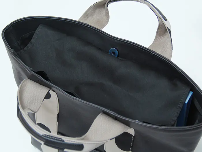 バッグの中身をさりげなくカバーする、スナップボタン仕様のフラップ付き。A4ファイルのような大きな荷物を入れた状態でも、このフラップなら閉じることが可能です。