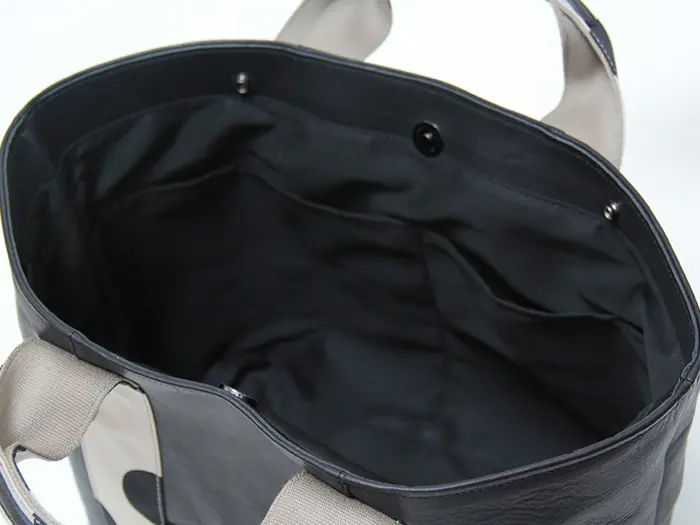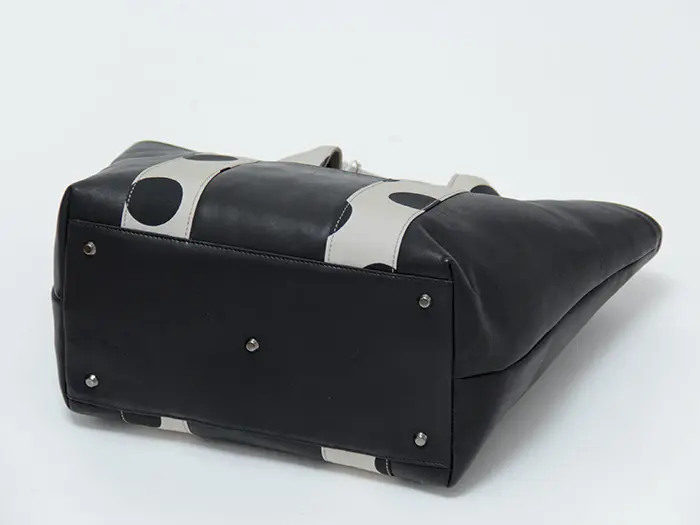 バッグ自体は軽量ながらハリのある革を使用しているため、安定感があり、荷物が少ない時でもしっかりと自立します。 また、底面には底鋲が付いているので、バッグを床や机に置いた際の擦れや汚れを防ぎ、美しい状態を長くキープできます。
