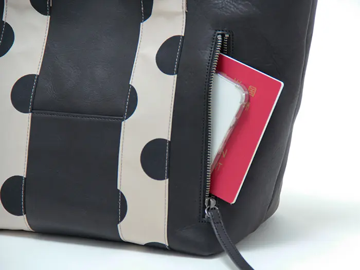 背面外側にはファスナーポケットを装備。 スマートフォンやICカードなど、メインを開けずに素早くアクセスしたい小物の収納に便利で、会計時などのスマートな所作をサポートします。