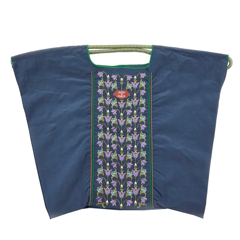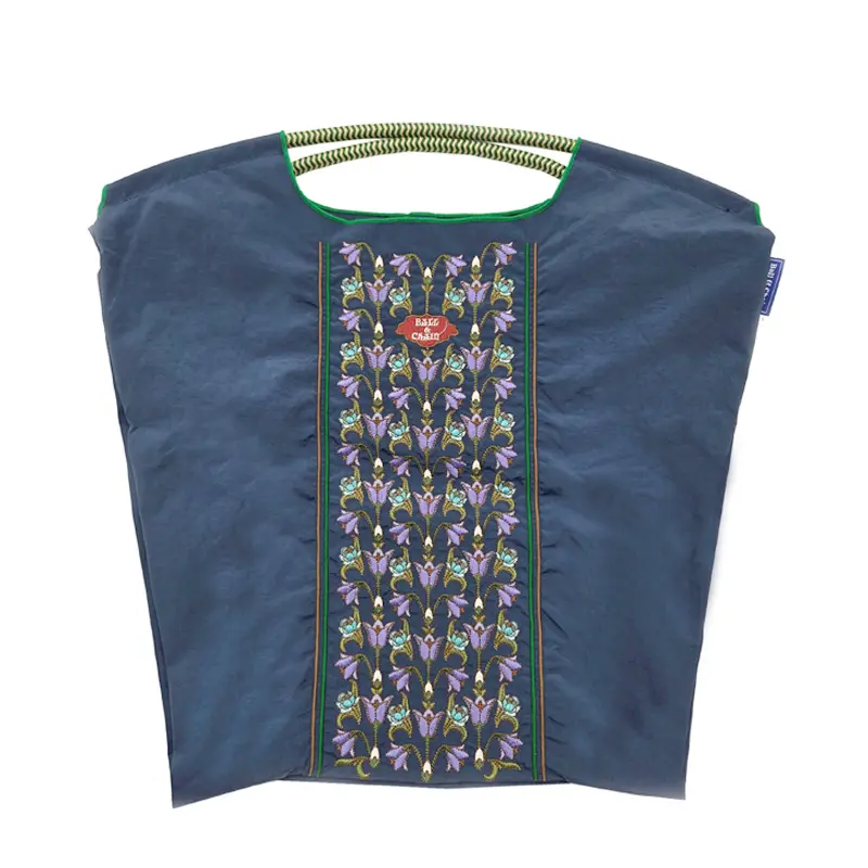 シックで落ち着いた深みのあるネイビーをベースに、センターラインに並んだお花がすっきりとした印象とほどよいきちんと感を演出し、NAVYのナイロンバッグにフラワーモチーフが美しく映えます。さらに、Ball&Chainのロゴが可愛らしいアクセントとなり、上品さと可愛らしさを兼ね備えたエコバッグに仕上がっています。