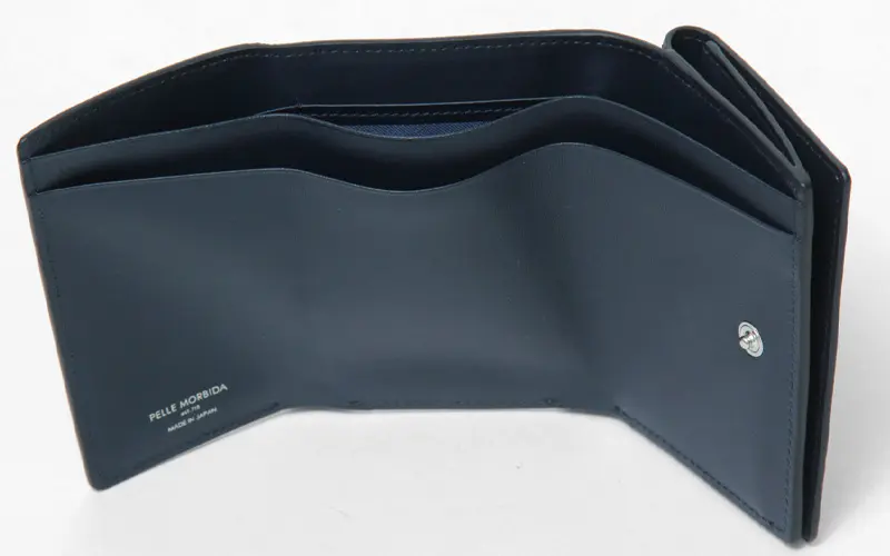 内側には、お札を種類別に分けて収納できる仕切り付きの札入れと、3枚分のカードポケットを装備しています。日常で必要十分な量を美しく収められる設計で、常に整理された状態を保てます。