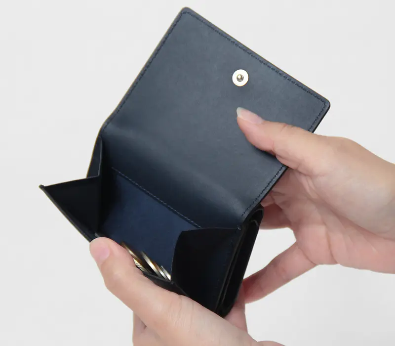 ポケットやミニバッグにすっきり収まる手のひらサイズながら、 お札・小銭・カードを分けてしっかりと収納できる高い機能性を備えています。スナップボタンで大きく開き、必要なものをスムーズに取り出せる設計は、キャッシュレス時代のスマートな身のこなしをサポートします。