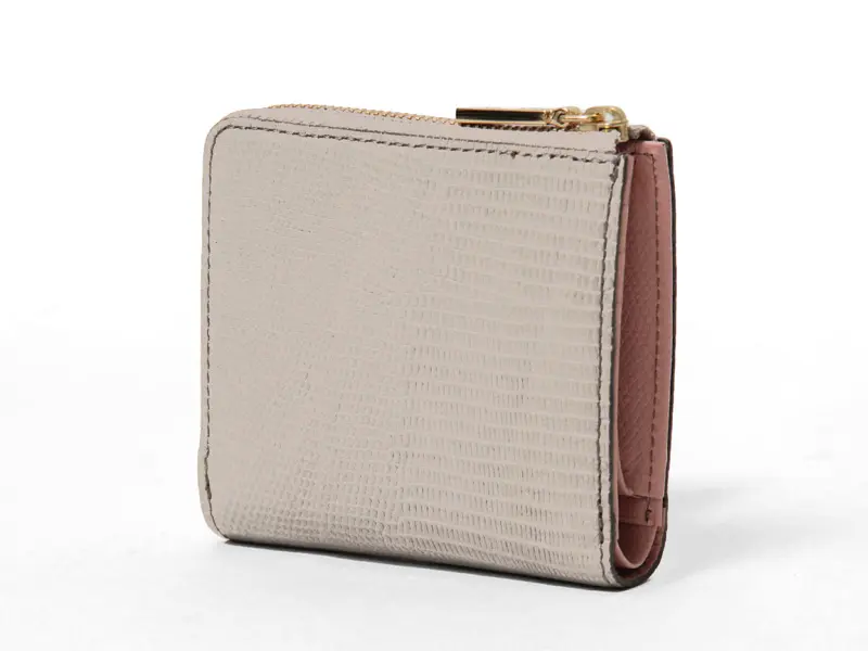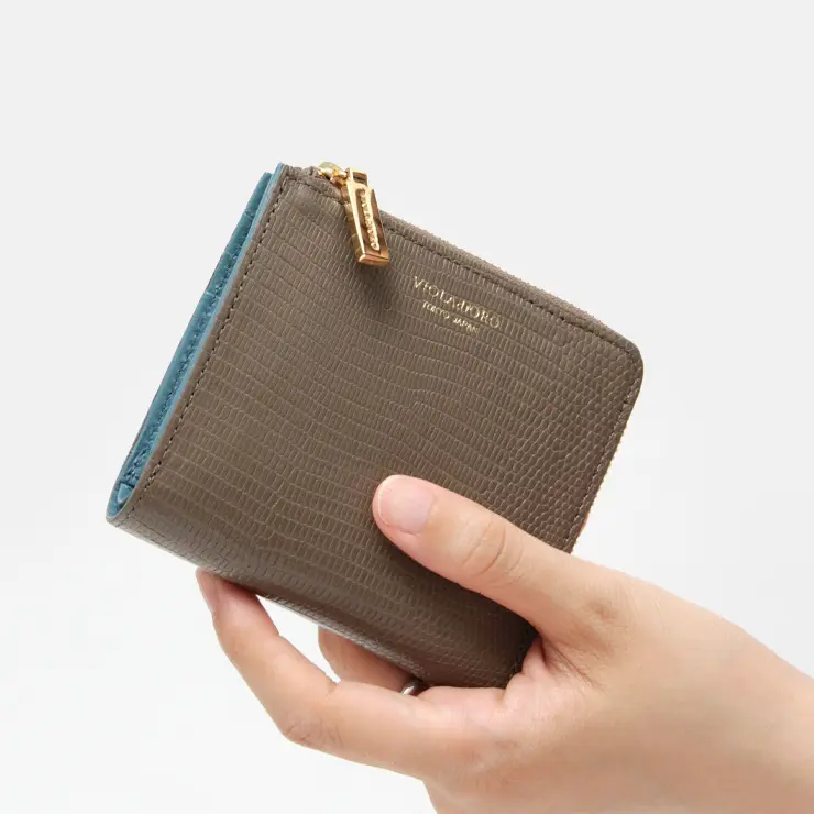 トレンドを取り入れつつも上品で女性らしいアイテムが揃うブランド"VIOLAd'ORO ヴィオラドーロ"。高級感のあるリザード型押しレザーを使用した二つ折り財布。毎日使うものだからこそ、持ちやすさや使い心地にこだわり、内側のカラーコントラストが華やかさを添えます。バッグから取り出すたびに気分も上がるデザインです。