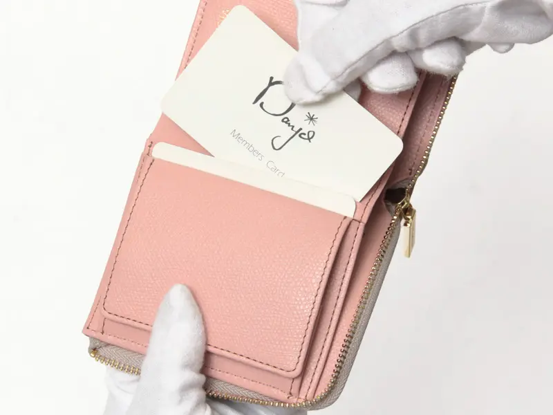 左手で持ったときも、お金やカードの収納が同じ向きになっているため、出し入れがスムーズに行えるよう考え抜かれたデザインです。開くとカード入れが3個所と小銭入れを備えており、小銭入れは中身が見やすく取り出しやすいボックス型。さらに小銭入れの背面にもカード入れが2つあります。お札入れは片側が開いているので、出し入れが簡単で、2個所のカード入れには免許証や保険証など、個人情報カードを安心して収納できます。