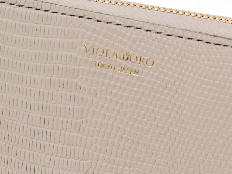 リザード(トカゲ)調の型押しを施した牛革は、細かなウロコ模様が美しく、ほのかな光沢が上質な雰囲気を添えます。"VIOLA=紫"、"ORO=金"を意味するブランド名の通り、ロゴや金具にはゴールドカラーをあしらい、世界観をより際立たせています。