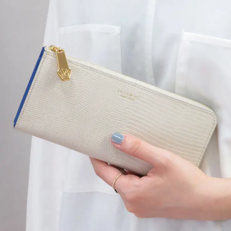 “VIOLAd’ORO(ヴィオラドーロ)”のアイテムは、トレンド感を取り入れながらも、上品で女性らしいアイテムを展開 。毎日使うものだからこそ、手に馴染むサイズ感と快適な使い心地にこだわったL字ファスナー長財布です。高級感のあるリザード型押しレザーに、内側カラーがさりげなく華やぎを添え、使うたびに気分を心地よく高めてくれます。