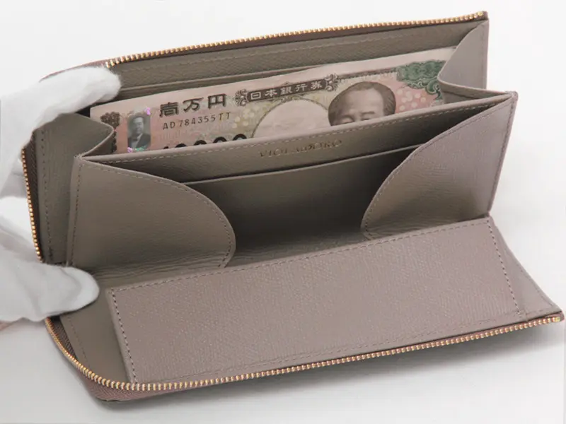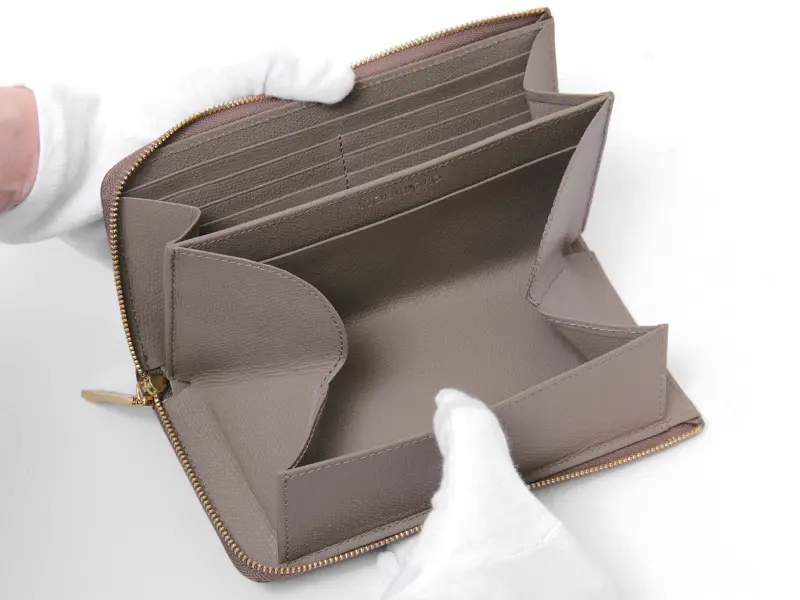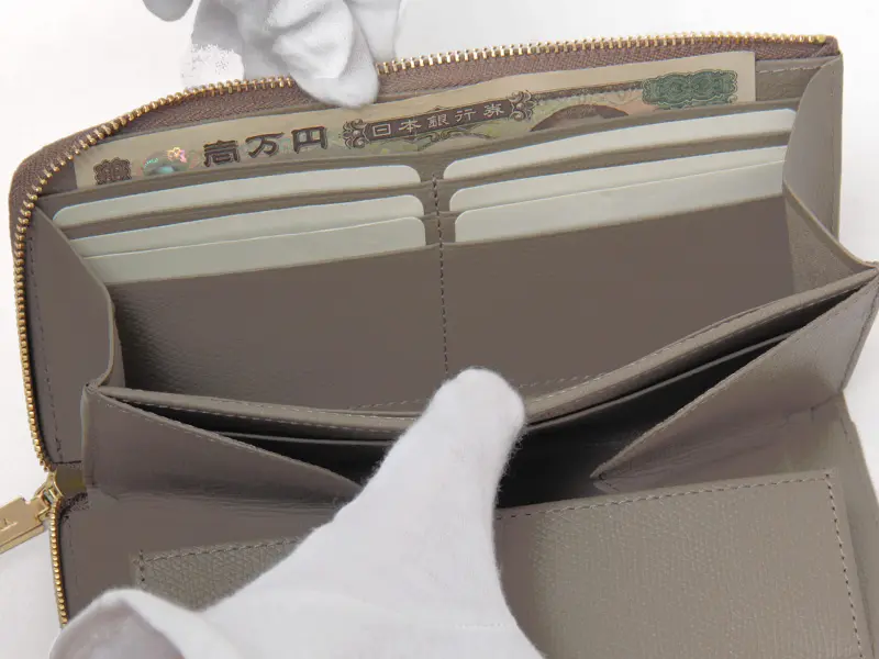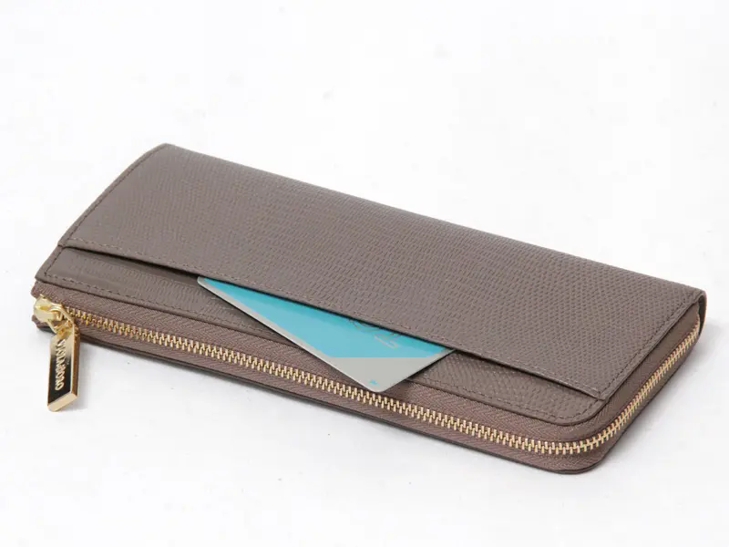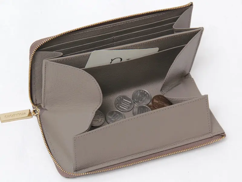 L字ファスナーを開けると中身がひと目で確認でき、会計時の動作もスムーズ。開いた瞬間に楽しめる配色のアクセントもポイントです。