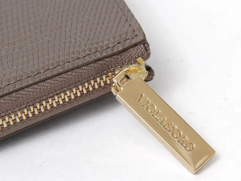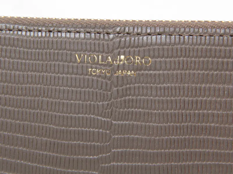 リザード(トカゲ)の型押しを施した牛革。細かなウロコの模様が繊細で、ほんのり光沢があり、ラグジュアリーな雰囲気。VIOLADOROは"VIOLA=紫"、"ORO=金"を意味し、ブランドロゴや金具もゴールドにこだわっています。