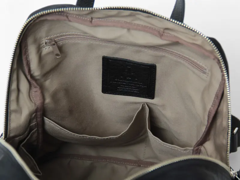開閉はダブルファスナー仕様で、どちらの肩に掛けていてもスムーズにアクセスできます。メイン収納はA4ノートがしっかり収まるゆとりのあるサイズ感。内部には小物の整理に役立つポケットが豊富で、片側にはボトルホルダーも備えているため、ペットボトルや折りたたみ傘を安定して収納できます。マチ幅は12cmと広めで収納力も十分。バッグ自体がとても軽いので、荷物が増えても快適に持ち運べます。