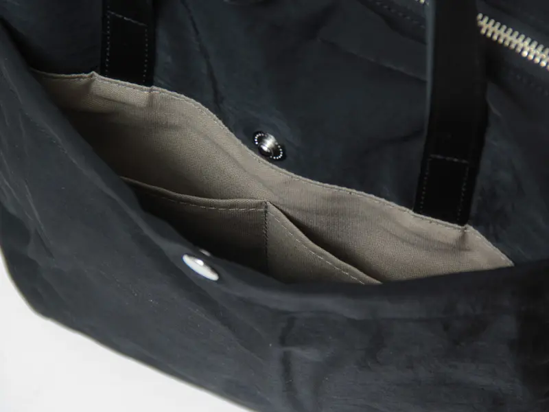 フロントには、A5ノートや雑誌も入るスナップボタン付きの大きめポケットを採用。スマートフォンにちょうどいい仕切りポケットも設けており、毎日の使いやすさにこだわったデザインです。