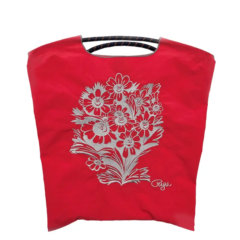 ブルーのデニム調ナイロン生地にはカラフルな花々が、赤い生地にはシルバーに輝くフラワーが刺繍され、どちらも持つだけで心が弾むデザインです。 遊び心あふれるポップでアイコニックな刺繍が魅力で、自分らしさを楽しく表現できるエコバッグに仕上がっています。 見ているだけで気分が明るくなる、そんな華やかさと個性が詰まったアイテムです。