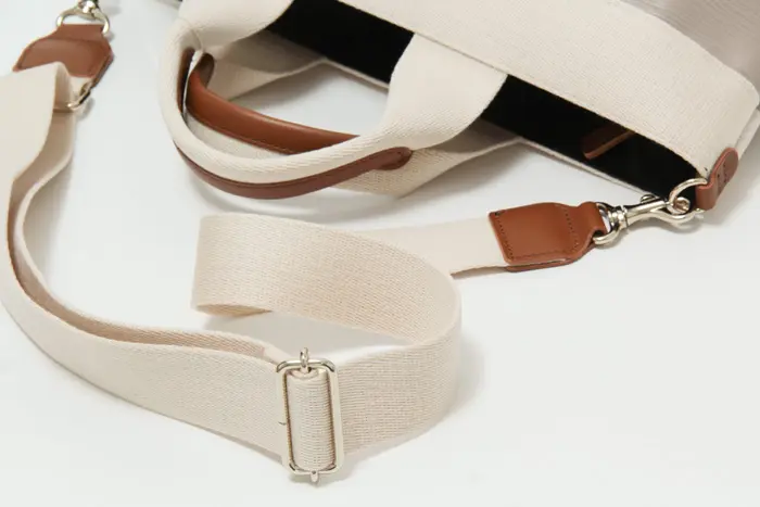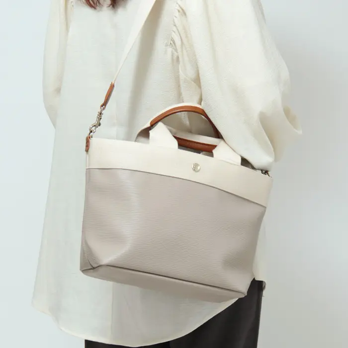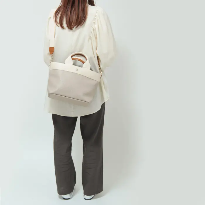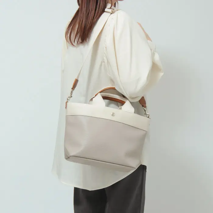 ショルダーストラップ付きで、手持ちも肩掛けも自在な2WAYバッグ。肩がけや斜めがけができるので両手が空き、通勤やお出かけに便利です。太めのストラップで肩への負担が少なく、持ち心地も快適。さらに、ストラップをつなぐDカンは内側に配置されているため、バッグの形が崩れず、すっきりとお使いいただけます。