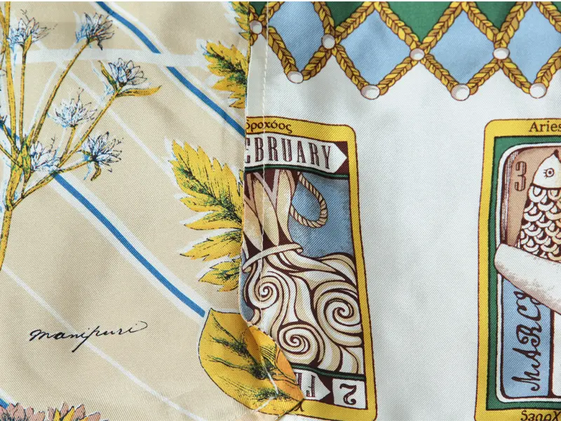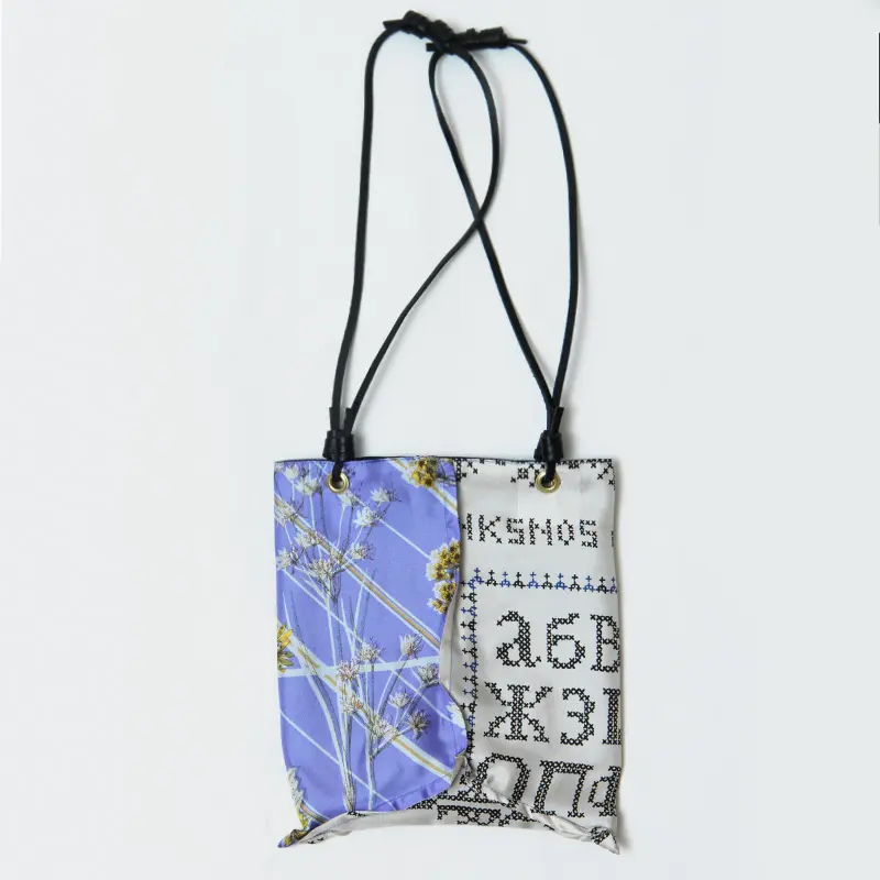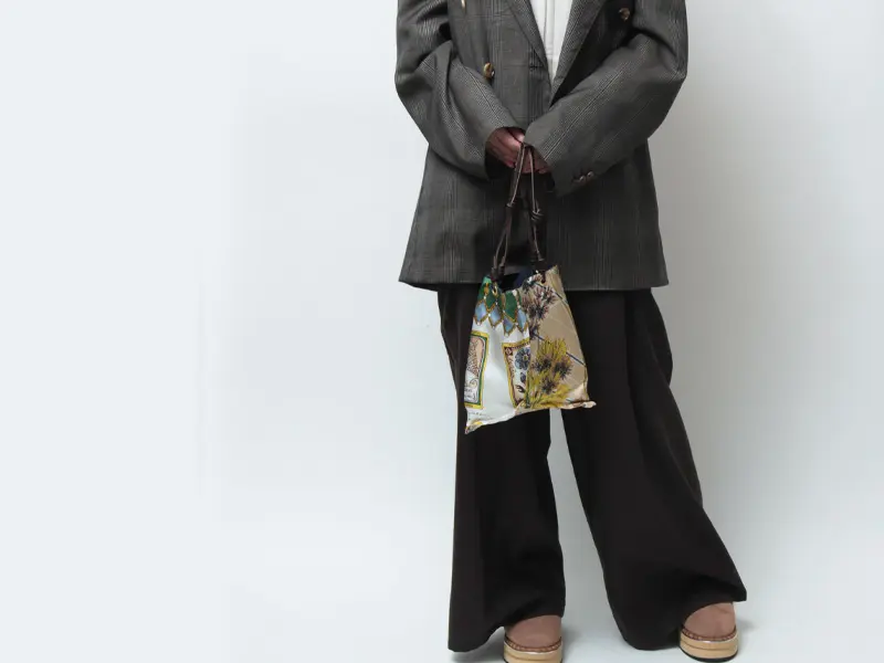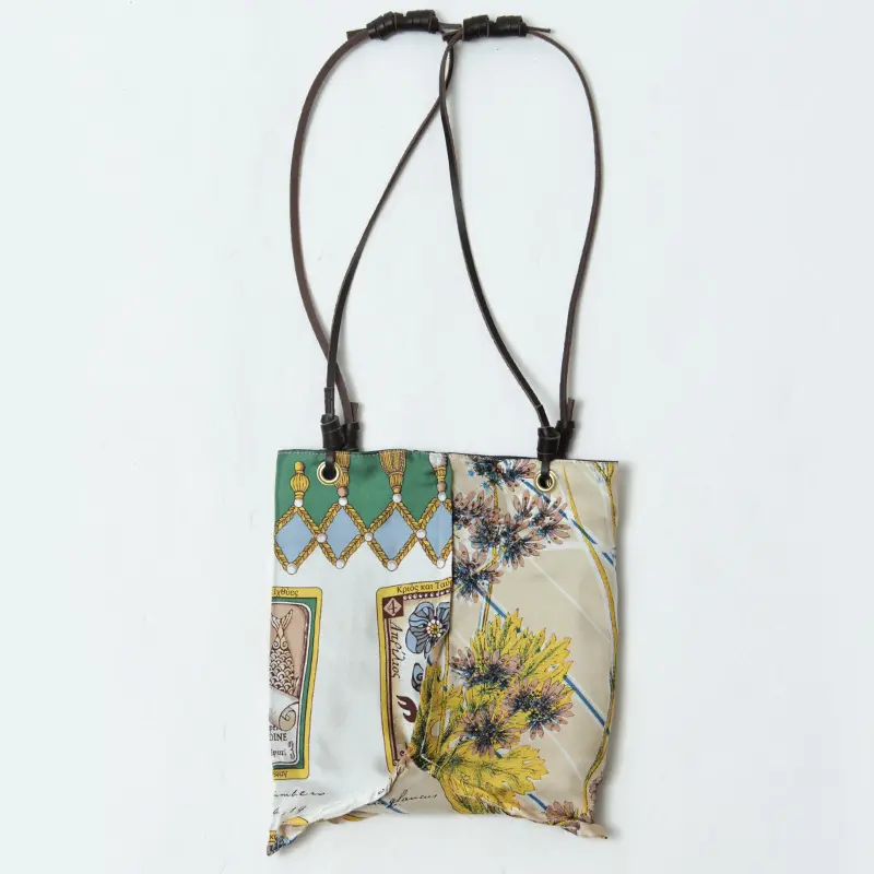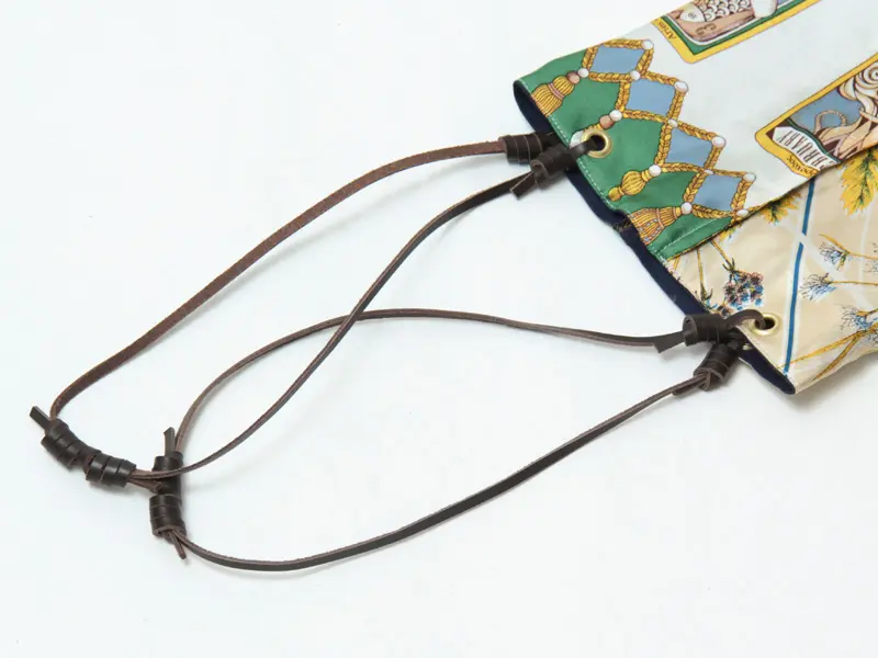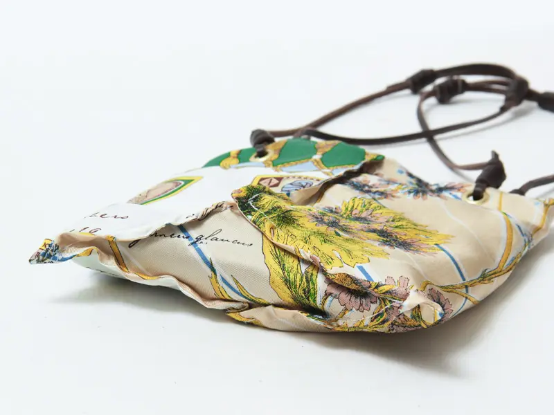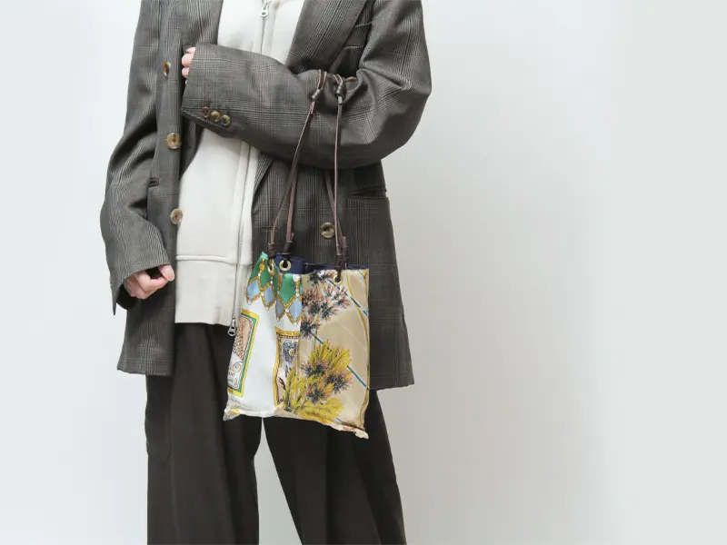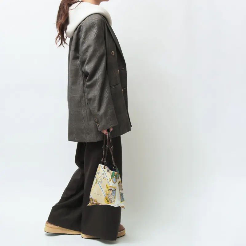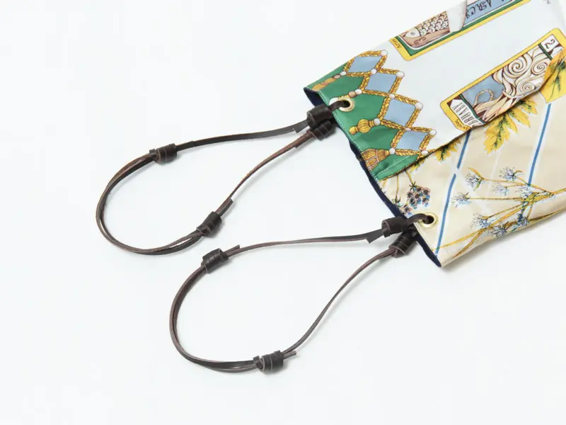 表側はシルクのスカーフ生地ならではの上品な光沢感が魅力。裏側は麻とコットンの柔らかな風合いを活かした生地を使い、素朴な質感の中に大人の品を漂わせます。ひとつのバッグで異なる素材の魅力を楽しめる、洗練された仕上がりです。