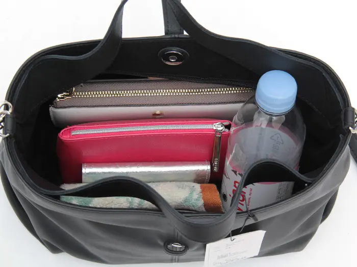 長財布やポーチなどの定番アイテムに加え、500mlボトルやエコバッグ、メガネケースなども入る適度な容量。荷物が多めの日も安心です。