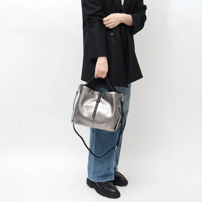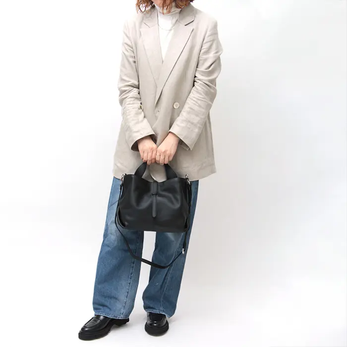 細やかなキメと柔らかな手触りが特徴の牛革を使用。上質さを感じられるだけでなく、「本革バッグは重い」というイメージを覆す軽さも魅力です。使うほどに馴染み、自分だけの風合いに育つレザーを日常で楽しめます。