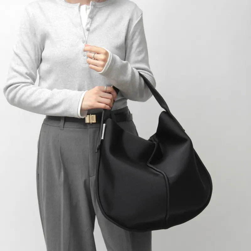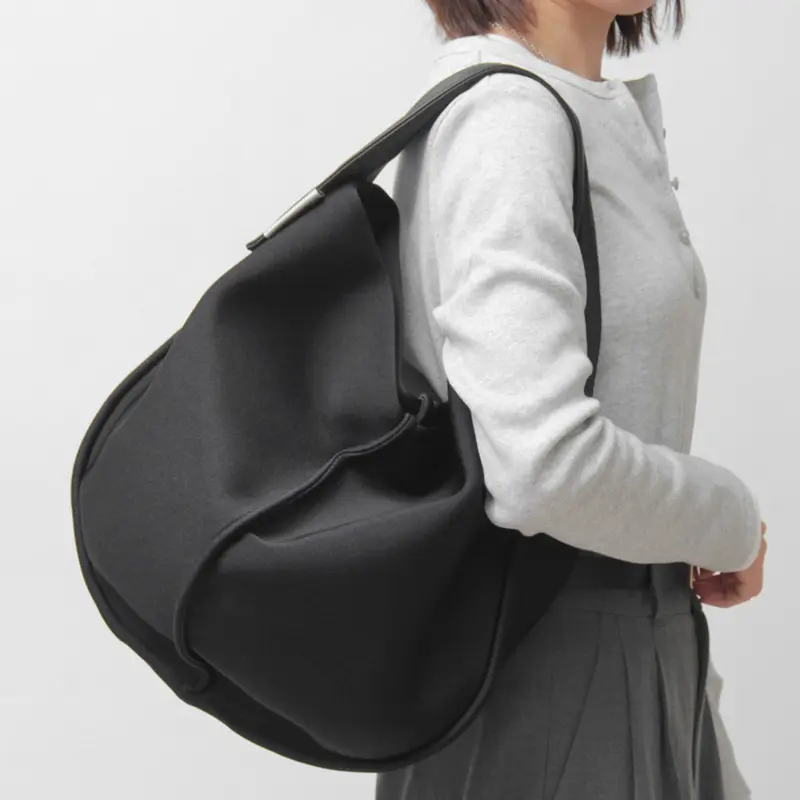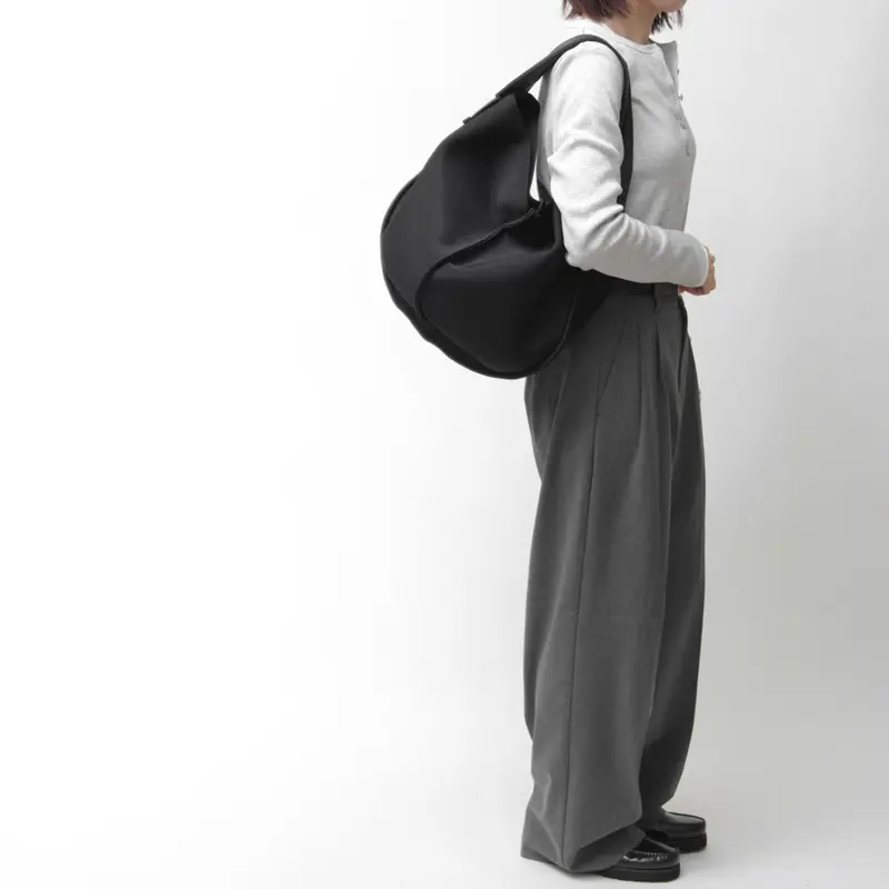 なめらかな曲線が美しい、くったり丸フォルムのワンショルダーバッグ。ベーシックながらも個性的なシルエットが、いつものコーディネートに洗練されたアクセントを加えてくれます。オールブラックのシンプルなデザインで、カジュアルからきれいめまで、どんなスタイルにも自然と馴染みます。休日のショッピングや、旅行のお供にもぴったりなアイテムです。
