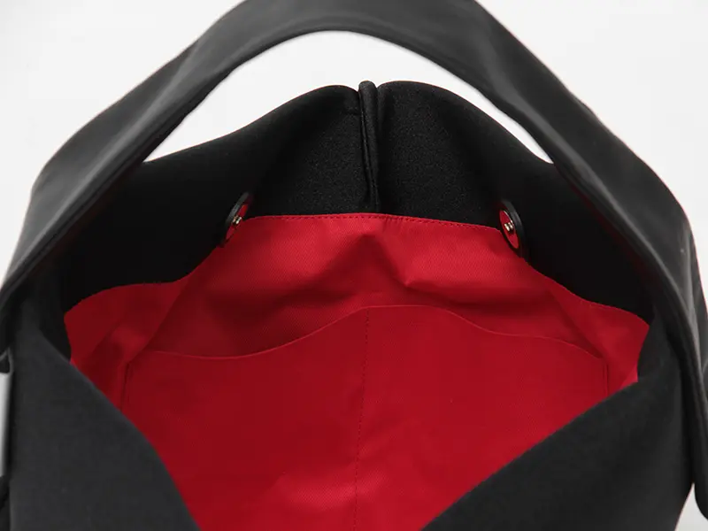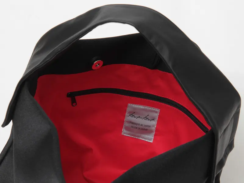 内装はkawa-kawaの象徴である鮮やかなレッド(綿/アカ)を採用。バッグを開けるたびに気分が上がるだけでなく、モノを探しやすくする効果もあります。内側にはポケットが搭載されており、機能性も抜群です。