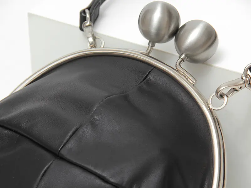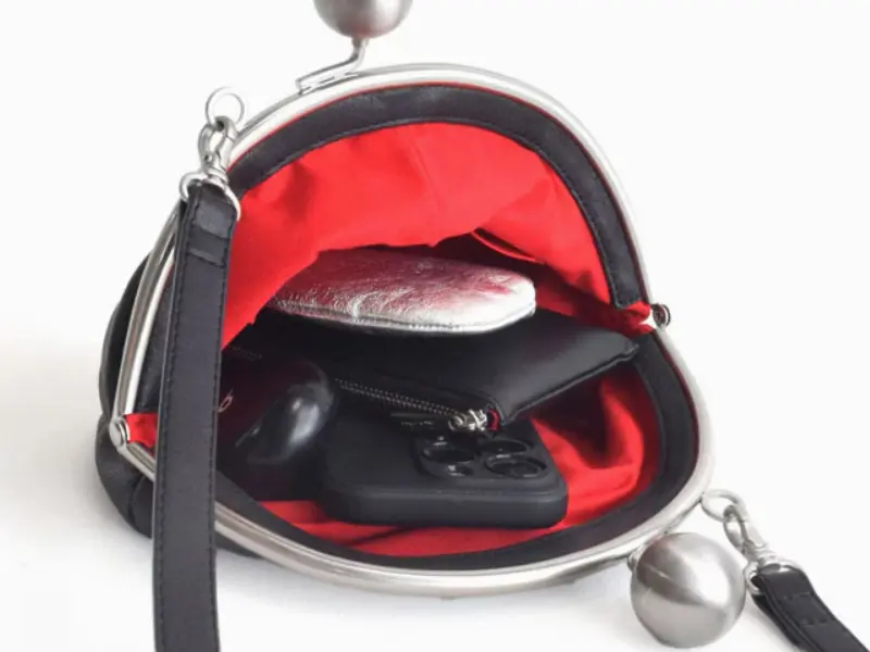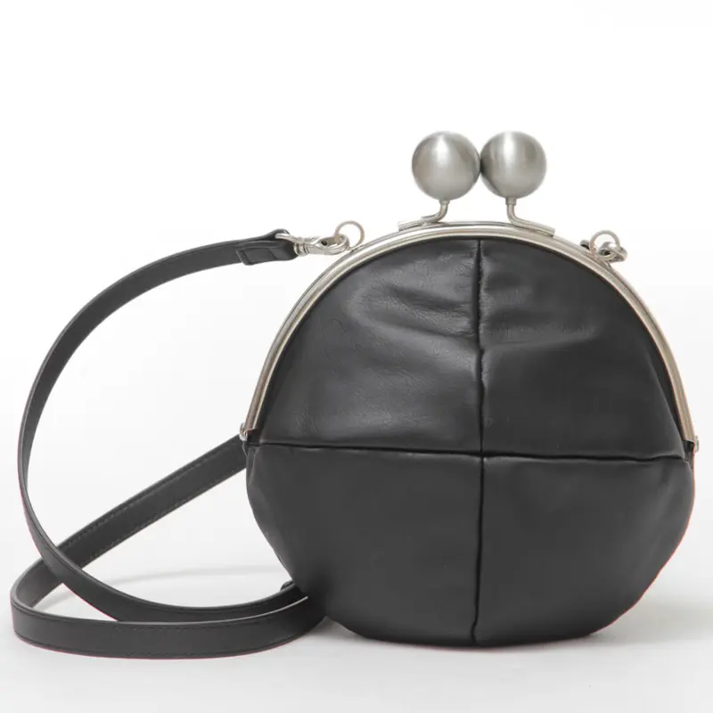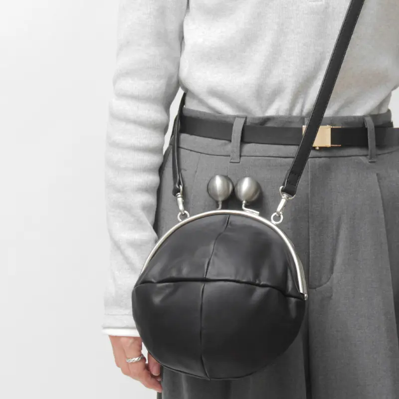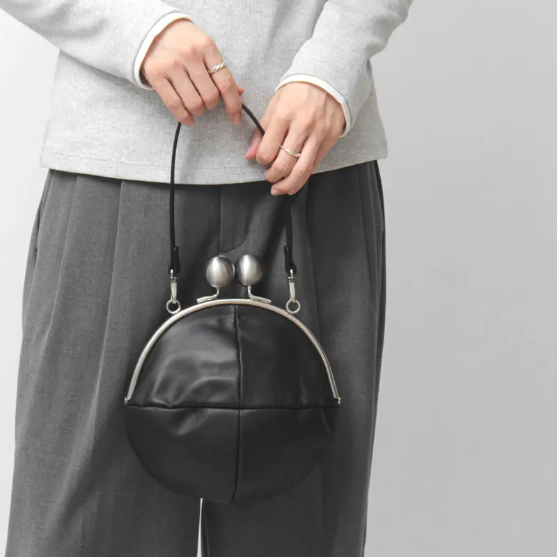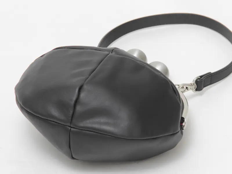 デザインの主役である大きな口金は、パチンと心地よく閉まり、しっかりと荷物を守る安心感があります。 丸く膨らむように設計されたユニークなフォルムは、見た目以上の収納力。 折り財布やスマートフォンなど、お出かけに必要なものがすっきりと収まる実用性も兼ね備えています。