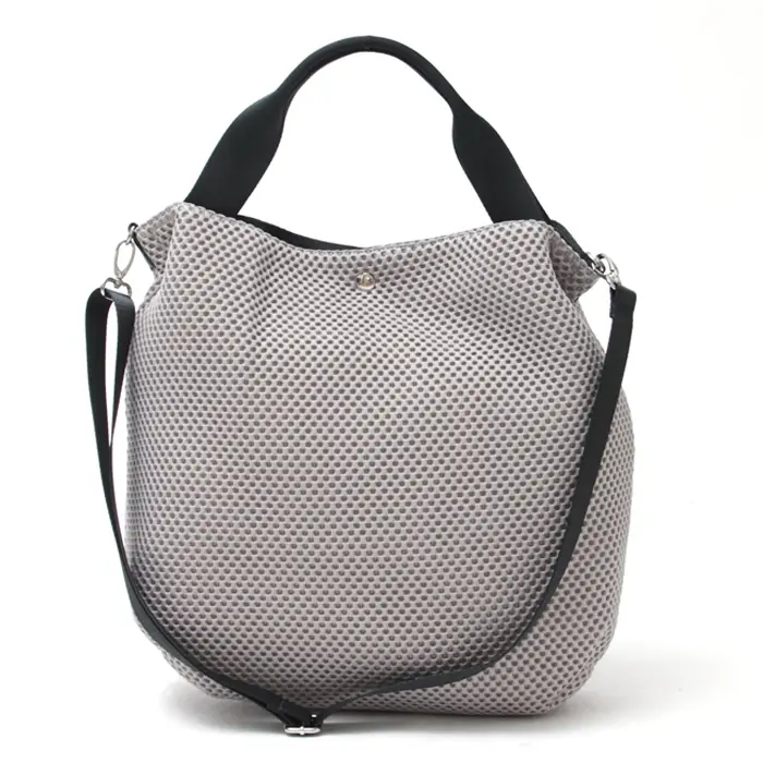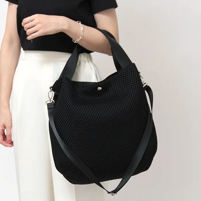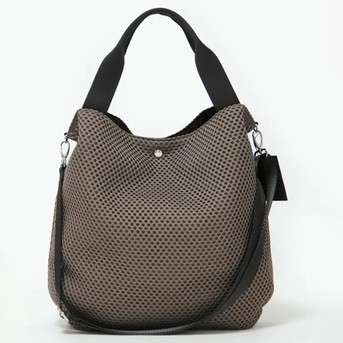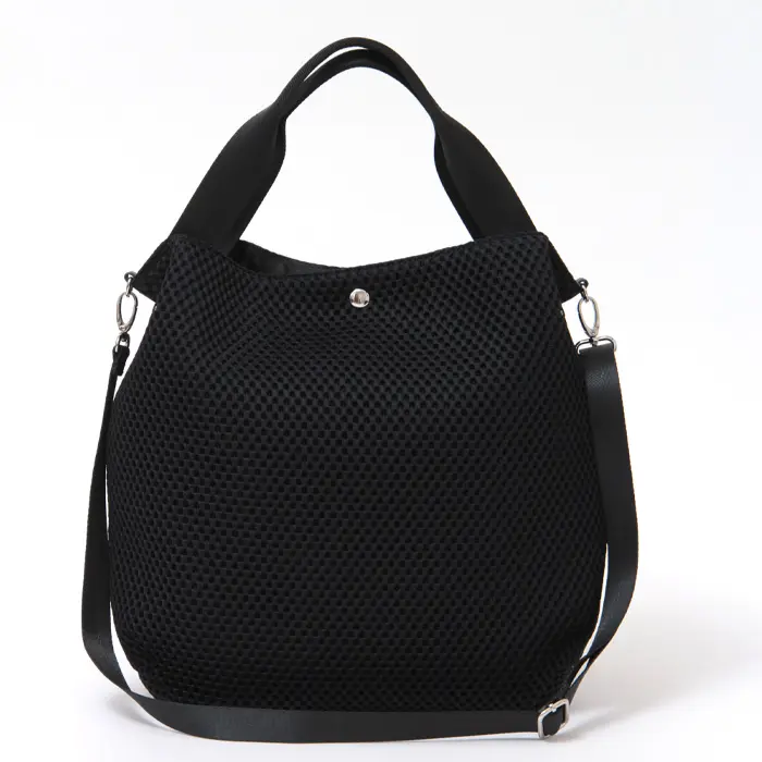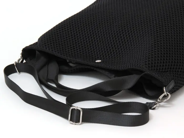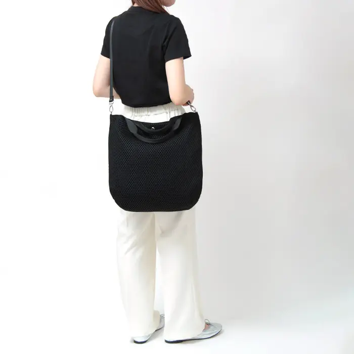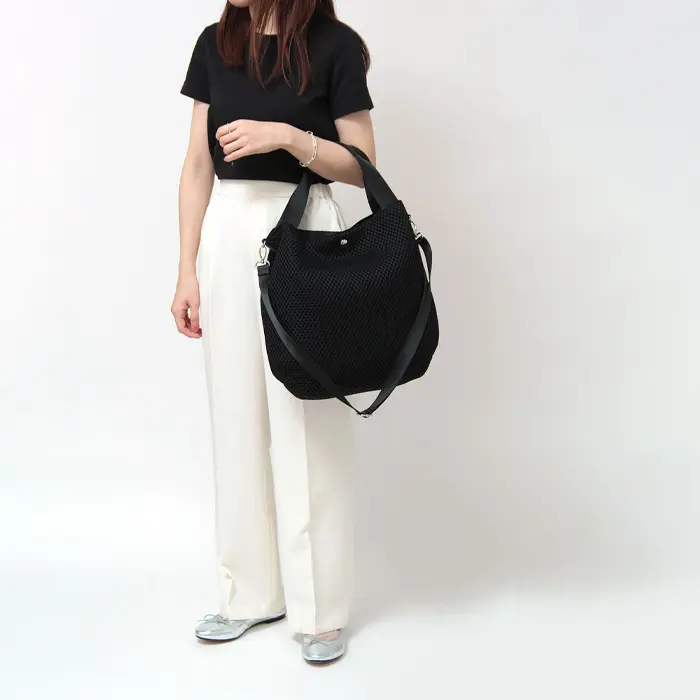 程よい太さのハンドルで手持ちも肩掛けも快適。薄手のトップスなら肩掛けもしやすいデザインです。付属のショルダーストラップは滑りがよく、長さ調整もスムーズ。取り外し可能なので、斜め掛けのアクティブスタイルにも対応します。