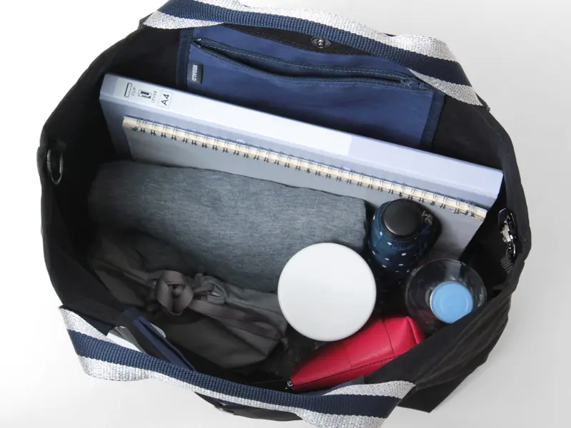 開閉はスナップボタンで簡単にアクセス可能。A4サイズがゆったり収まり、マチ幅もしっかり確保されているため収納力は十分。内側には小物の整理に便利なポケットを配置し、スマホやICカード、鍵などをすっきり管理できます。バッグ自体が軽量なので、荷物が増えても負担になりにくいのもポイントです。