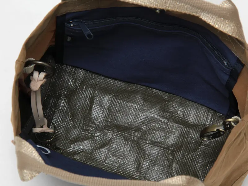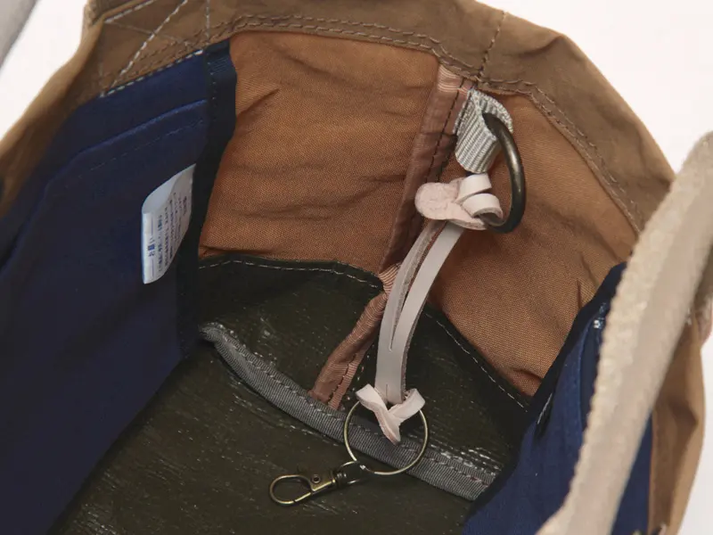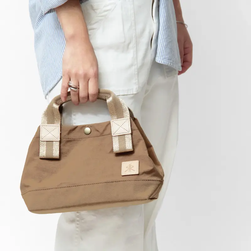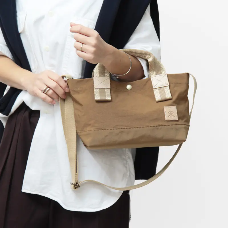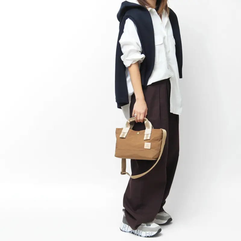生地には塩縮加工を施したナイロンを採用。苛性ソーダに浸して繊維を縮ませることで、独特の凹凸感と自然なシボが生まれます。マットで落ち着いた質感は使うほどに雰囲気が増し、コーディネートにこなれ感をプラス。一般的なナイロンに比べてハリとコシがあり、自立するほどしっかりした素材で、日常使いにも扱いやすいタフさが魅力です。