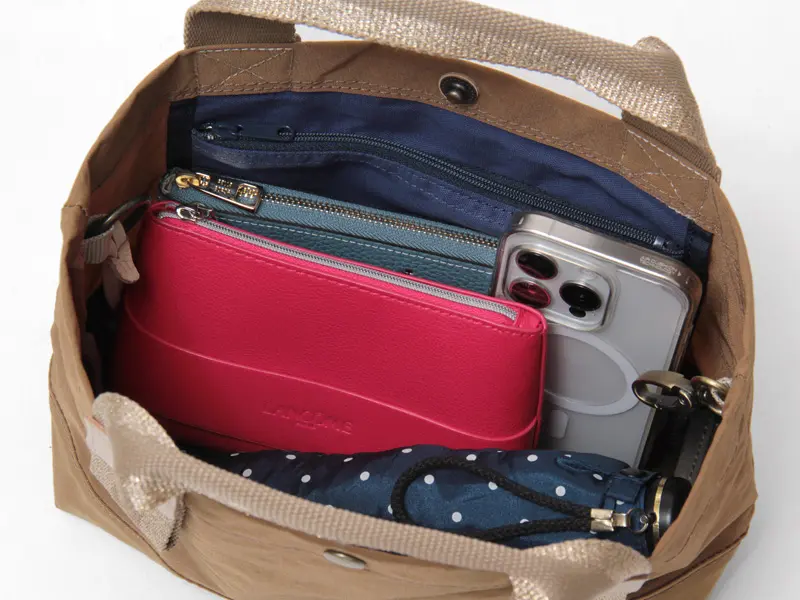 スナップボタンで簡単に開閉でき、長財布・スマホ・ポーチ・折りたたみ傘などが収納できます。大きすぎず小さすぎない絶妙なサイズ感で、使いやすさも抜群。内側ポケット付きで、ICカードや鍵などの小物も迷子にならずにきれいに整頓できます。