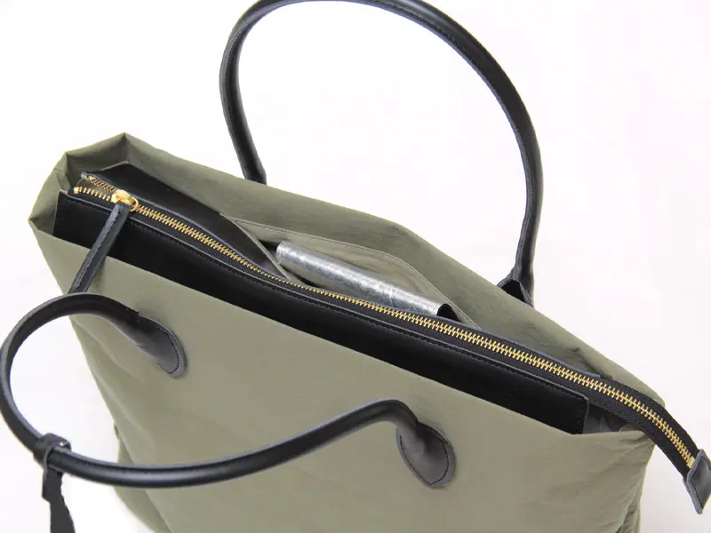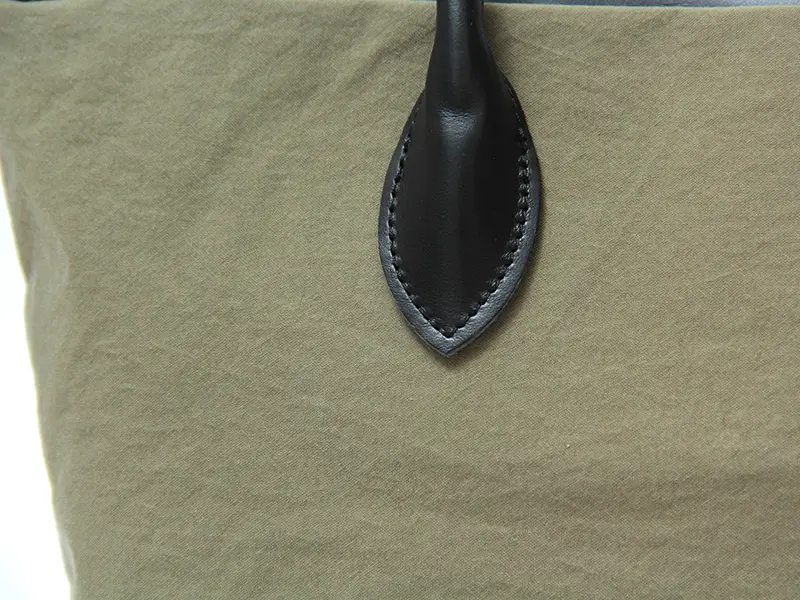 素材には、日本の老舗メーカー、小松マテーレ社が開発したKONBUナイロンを採用。海産物の昆布のようなドライな質感とマットな表情が魅力です。ハリとコシがあがあり、荷物が少なくても自立するほどの丈夫さ。撥水性があり、表面からの水の染み込みを防いでくれるため、突然の雨でも安心してお使いいただけます。