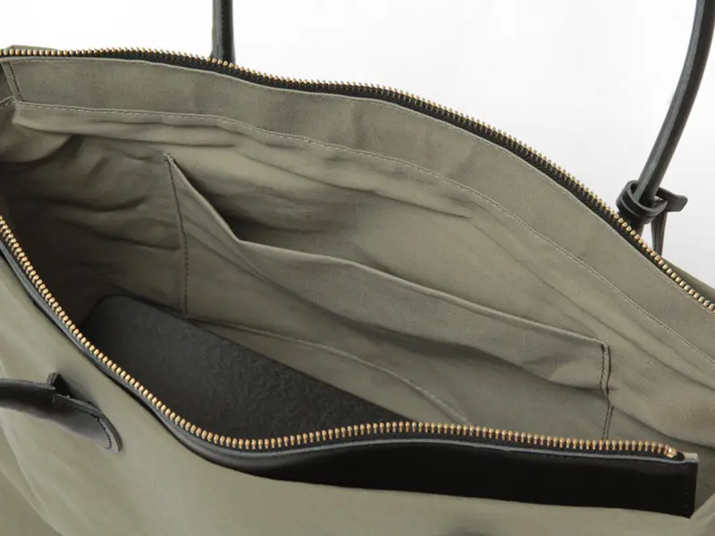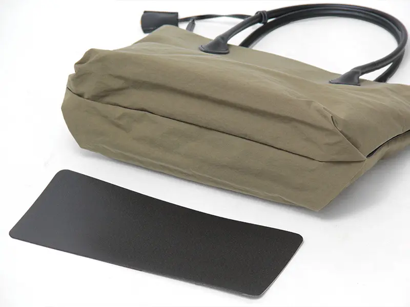 A4サイズのノートやラップトップがぴったり収まる実用的なサイズ。マチが広いため、お弁当箱や500mlのペットボトルも安定して収納可能です。また、荷物の重さで底がたわむのを防ぐ底板付きなので、たくさん入れても型崩れしにくく、通勤やデイリーユースでスマートにお使いいただけます。