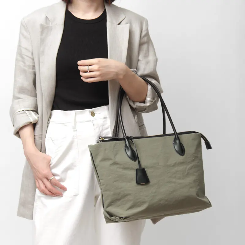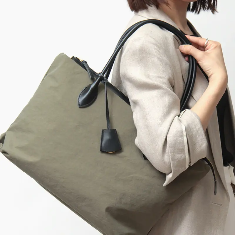 日本発ブランド「MUZICA VITA(ムジカヴィータ)」より、エレガントな女性のためのナイロントートバッグ。 A4サイズやPCも楽に収まる収納力に加え、突然の雨でも安心な撥水素材を採用し、利便性を追求しました。肩に優しいレザーハンドルや、大容量でもすっきり見えるデザインが魅力。荷物が多くても、常に洗練されたスマートな装いを叶えます。